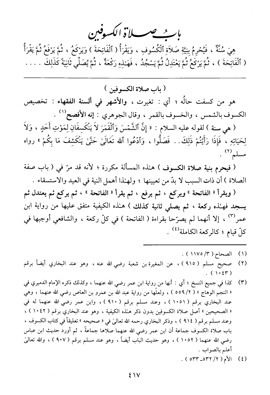 (٣) كذا في جميع النسخ؛ أي: أنها من رواية ابن عمر رضي الله عنهما، وكذلك ذكره الإمام الدميري في "النجم الوهاج" (٢/ ٥٥٩)، ولعلّها من رواية عبد الله بن عمرو بن العاص رضي الله عنهما، وهي عند البخاري برقم (١٠٥١)، وعند مسلم برقم (٩١٠)، وابن عمر رضي الله عنهما له في "الصحيحين" أصل صلاة الكسوفين بدون ذكر هذه الكيفية، وهو عند البخاري برقم (١٠٤٢)، وعند مسلم برقم (٩١٤)، وذكر البخاري رحمه الله تعالى في "صحيحه" تعليقًا في كتاب الكسوف، باب صلاة الكسوف جماعة أن ابن عمر رضي الله عنهما صلاها جماعةً، ثم أورد حديث ابن عباس رضي الله عنهما (١٠٥٢)، وهو حديث الباب أيضًا، وهو عند مسلم برقم (٩٥٧)، والله تعالى أعلم بالصواب.