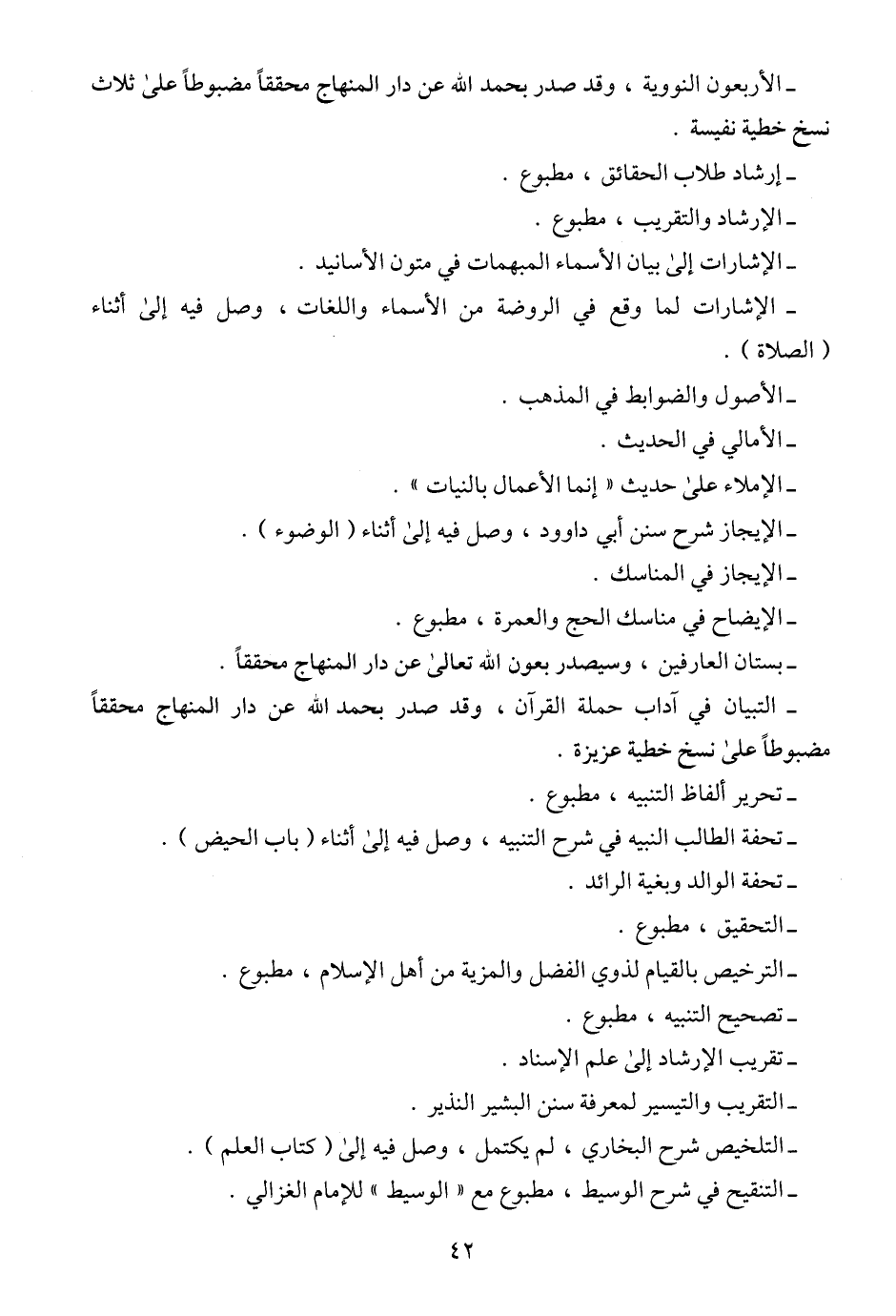 - الأربعون النووية، وقد صدر بحمد الله عن دار المنهاج محققًا مضبوطًا على ثلاث نسخ خطية نفيسة.