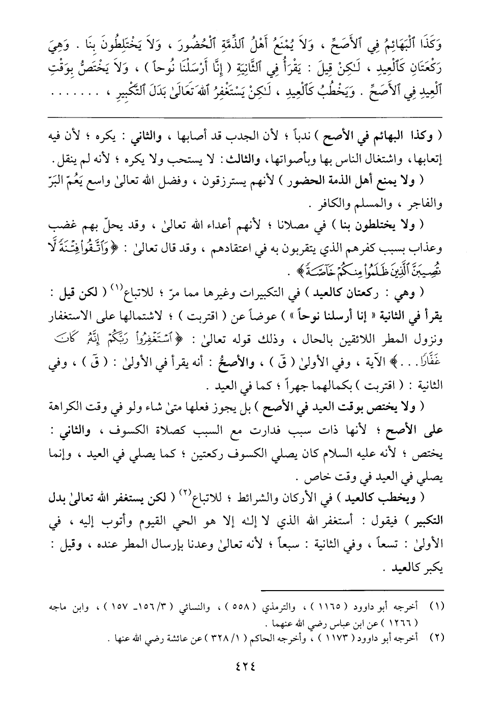 (وهي: ركعتان كالعيد) في التكبيرات وغيرها مما مرّ؛ للاتباع (١) (لكن قيل: يقرأ في الثانية "إنا أرسلنا نوحًا") عوضًا عن (اقتربت)؛ لاشتمالها على الاستغفار ونزول المطر اللائقين بالحال، وذلك قوله تعالى: {اسْتَغْفِرُوا رَبَّكُمْ إِنَّهُ كَانَ غَفَّارًا ... } الآية، وفي الأولى (ق)، والأصحُّ: أنه يقرأ في الأولى: (ق)، وفي الثانية: (اقتربت) بكمالهما جهرًا؛ كما في العيد.