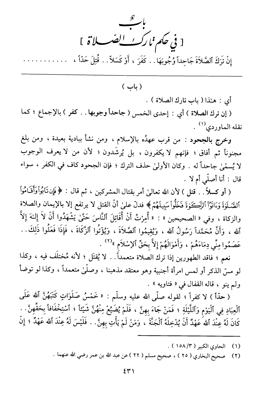 (حدًّا) لا كفرًا؛ لقوله صلّى الله عليه وسلّم: "خَمْسُ صَلَوَاتٍ كَتبَهُنَّ الله عَلَى الْعِبَادِ فِي الْيَوْمِ وَاللَّيْلَةِ؛ فَمَنْ جَاءَ بِهِنَّ، فَلَمْ يُضَيِّعْ مِنْهُنَّ شَيْئًا، اسْتِخْفَافًا بِحَقِّهِنَّ .. كَانَ لَهُ عِنْدَ الله عَهْدٌ أَنْ يُدْخِلَهُ الْجَنَةَ، وَمَنْ لَمْ يَأْتِ بِهِنَّ .. فَلَيْسَ لَهُ عِنْدَ الله عَهْدٌ؛ إِنْ