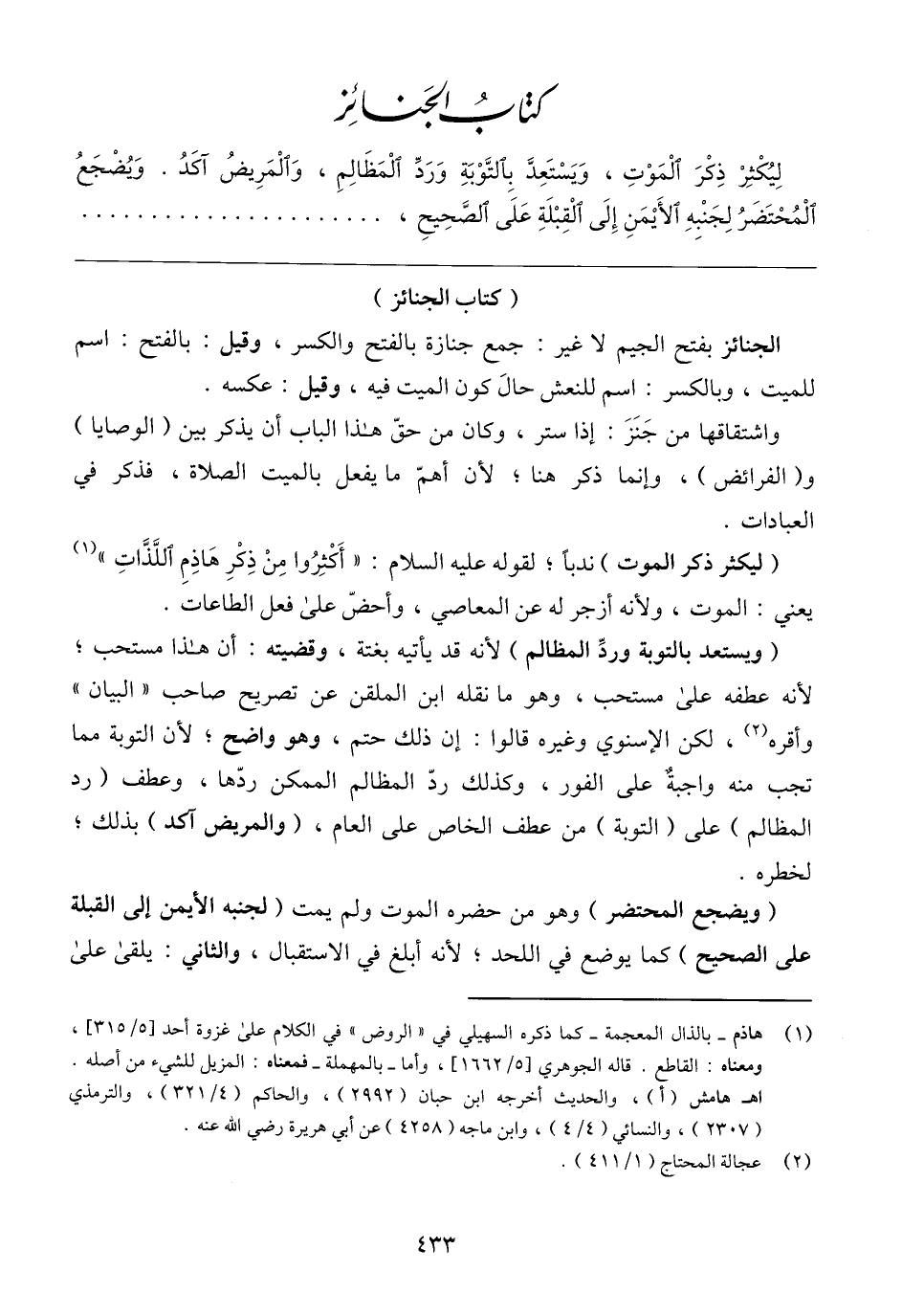واشتقاقها من جَنَزَ: إذا ستر، وكان من حقّ هذا الباب أن يذكر بين (الوصايا) و (الفرائض)، وإنما ذكر هنا؛ لأن أهمّ ما يفعل بالميت الصلاة، فذكر في العبادات.