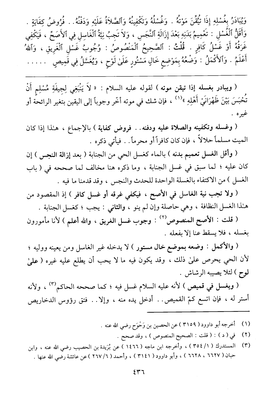 (ويبادر بغسله إذا تيقن موته) لقوله عليه السلام: "لَا يَنْبَغِي لِجِيفَةِ مُسْلِمٍ أَنْ تُحْبَسَ بَيْنَ ظَهْرَانَيْ أَهْلِهِ" (١)، فإن شك في موته أخّر وجوبًا إلى اليقين بتغير الرائحة أو غيره.