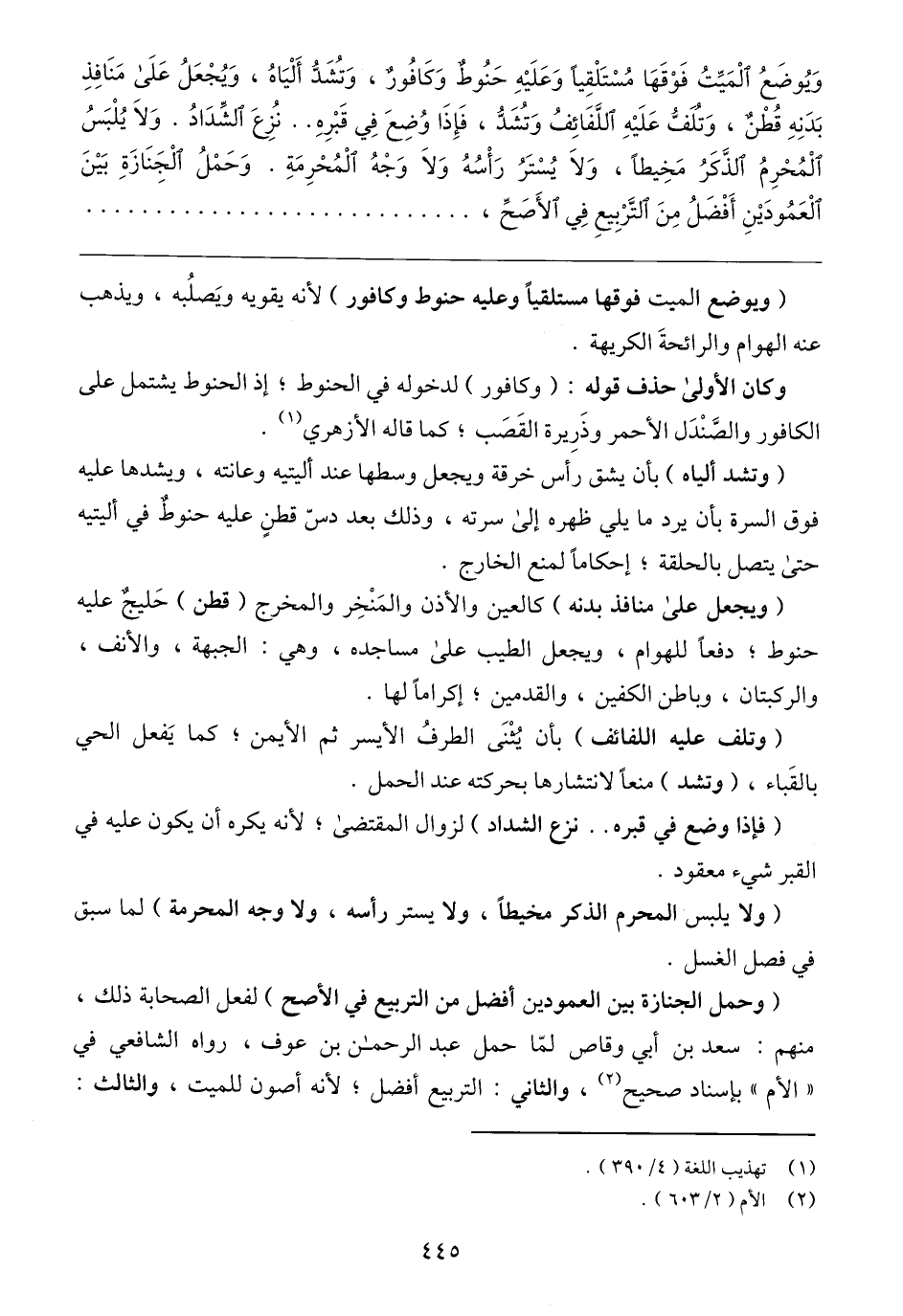 (ويجعل على منافذ بدنه) كالعين والأذن والمَنْخِر والمخرج (قطن) حَليجٌ عليه حنوط؛ دفعًا للهوام، ويجعل الطيب على مساجده، وهي: الجبهة، والأنف، والركبتان، وباطن الكفين، والقدمين؛ إكرامًا لها.