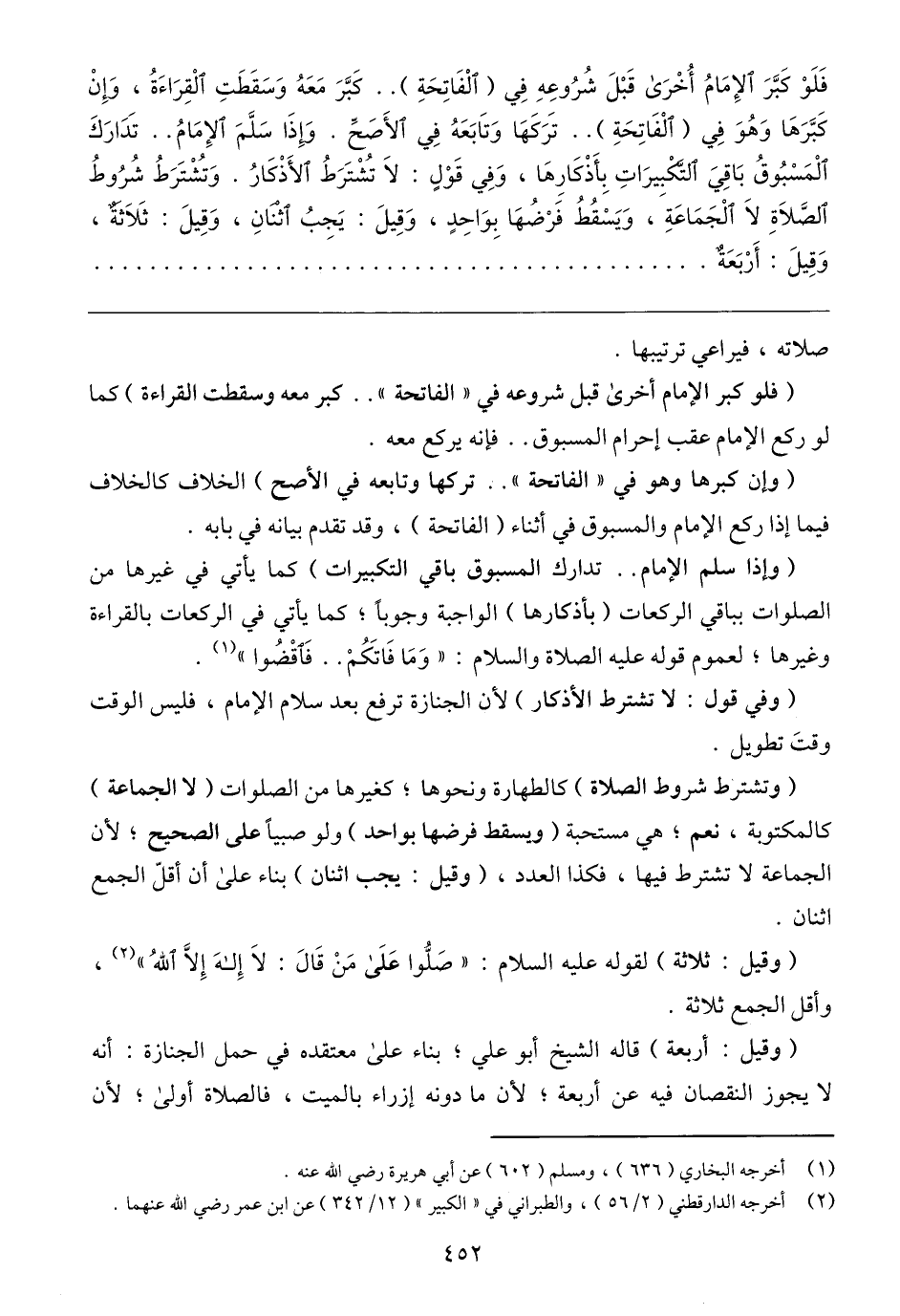 (وإذا سلم الإِمام .. تدارك المسبوق باقي التكبيرات) كما يأتي في غيرها من الصلوات بباقي الركعات (بأذكارها) الواجبة وجوبا؛ كما يأتي في الركعات بالقراءة وغيرها؛ لعموم قوله عليه الصلاة والسلام: "وَمَا فَاتَكُمْ .. فَأقْضُوا" (١).