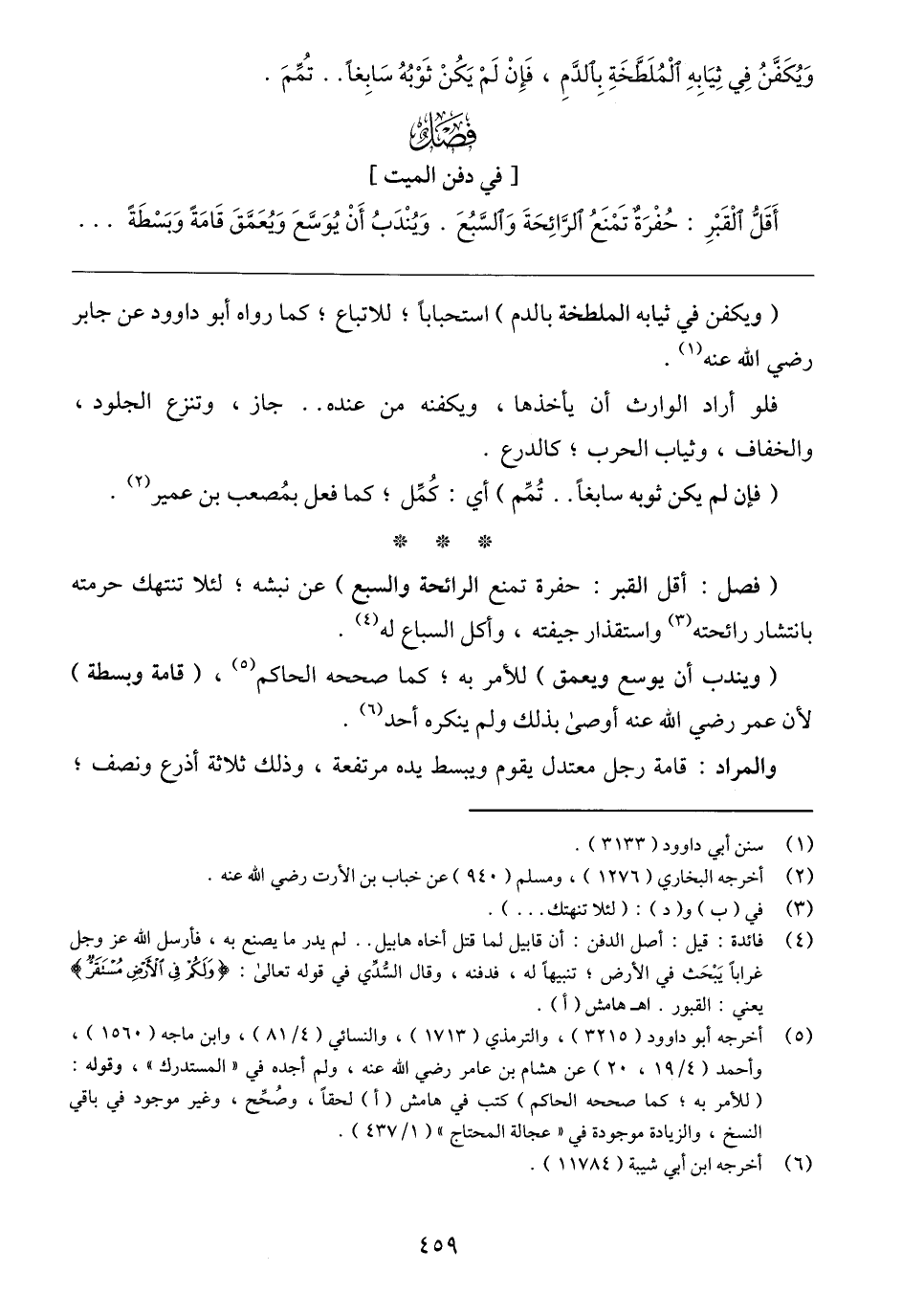 (ويندب أن يوسع ويعمق) للأمر به، كما صححه الحاكم (٥)، (قامة وبسطة) لأن عمر رضي الله عنه أوصى بذلك ولم ينكره أحد (٦).