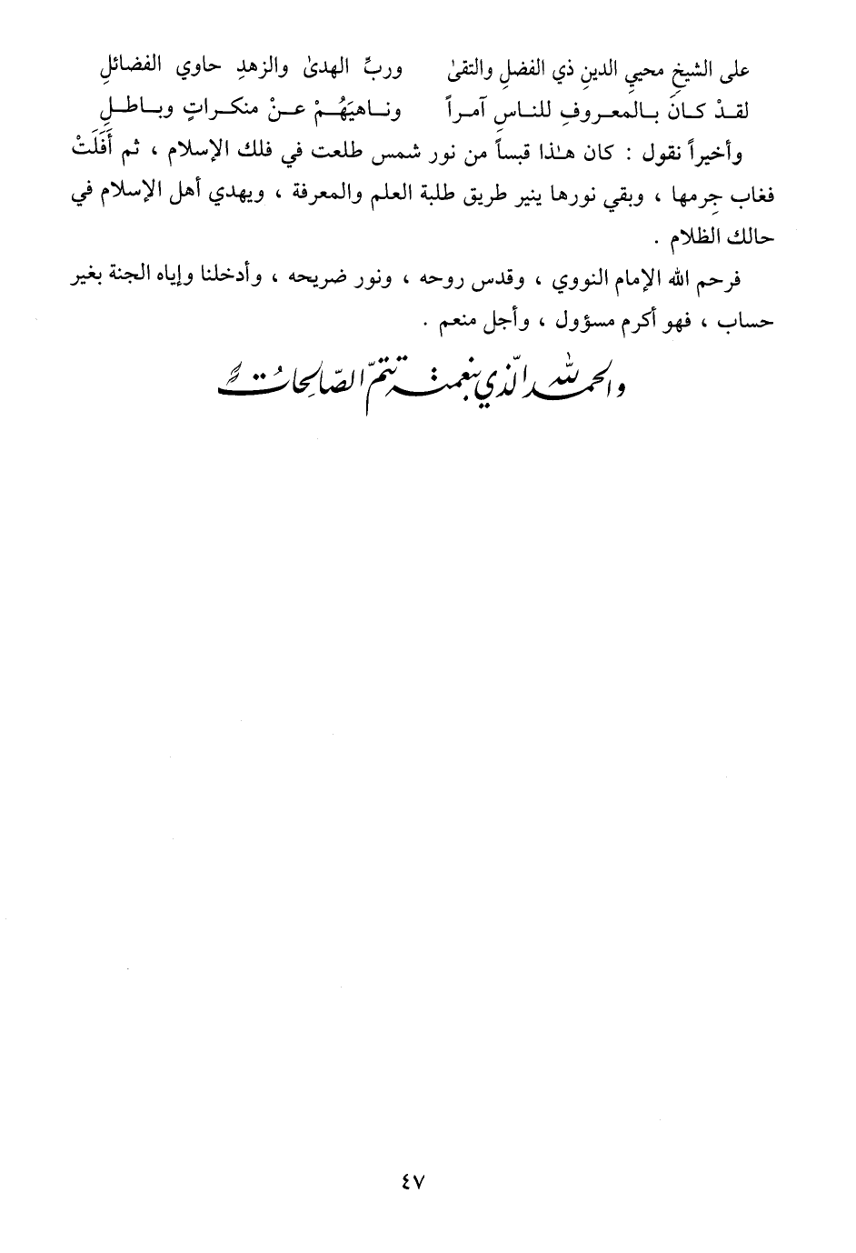 فرحم الله الإمام النووي، وقدس روحه، ونور ضريحه، وأدخلنا وإياه الجنة بغير حساب، فهو أكرم مسؤول، وأجل منعم.