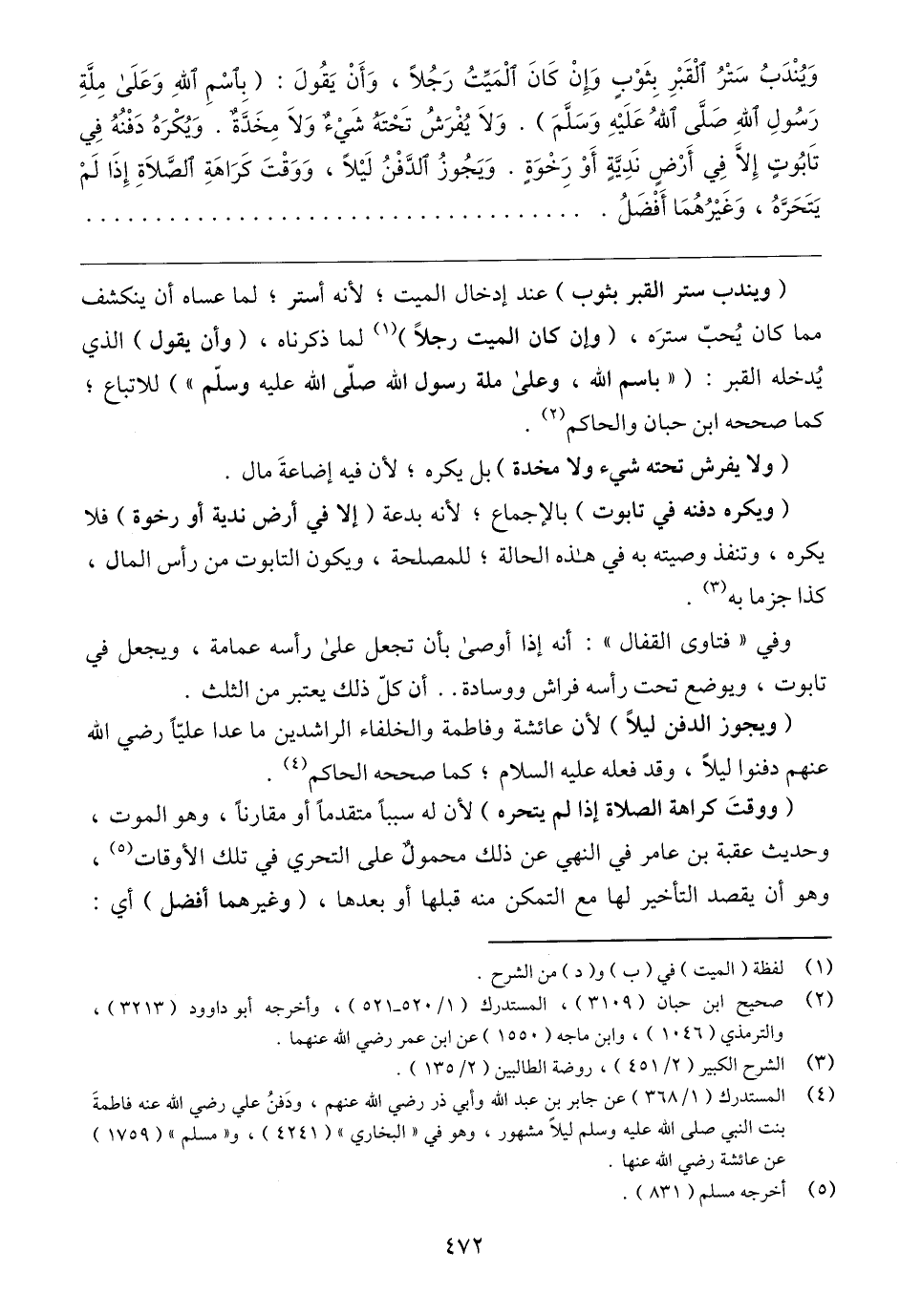 (٤) المستدرك (١/ ٣٦٨) عن جابر بن عبد الله وأبي ذر رضي الله عنهم، ودَفنُ علي رضي الله عنه فاطمةَ بنت النبي صلى الله عليه وسلم ليلًا مشهور، وهو في "البخاري" (٤٢٤١)، و"مسلم" (١٧٥٩) عن عائشة رضي الله عنها.