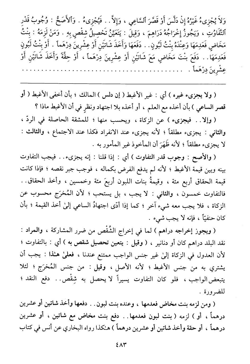 (ومن لزمه بنت مخاض فعدمها، وعنده بنت لبون .. دفعها وأخذ شاتين أو عشرين درهمًا، أو) لزمه (بنت لبون فعدمها .. دفع بنت مخاض مع شاتين، أو عشرين درهمًا، أو حقة وأخذ شاتين أو عشرين درهمًا) هكذا رواه البخاري عن أنس في كتاب