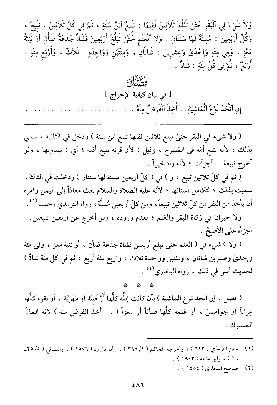 (ثم في كلّ ثلاثين تبيع، و) في (كلّ أربعين مسنة لها سنتان) ودخلت في الثالثة، سميت بذلك؛ لتكامل أسنانها؛ لأنه عليه الصلاة والسلام بعث معاذًا إلى اليمن وأمره أن يأخذ من البقر من كلّ ثلاثين تبيعًا، ومن كلّ أربعين مُسنَة، رواه الترمذي وحسنه (١).