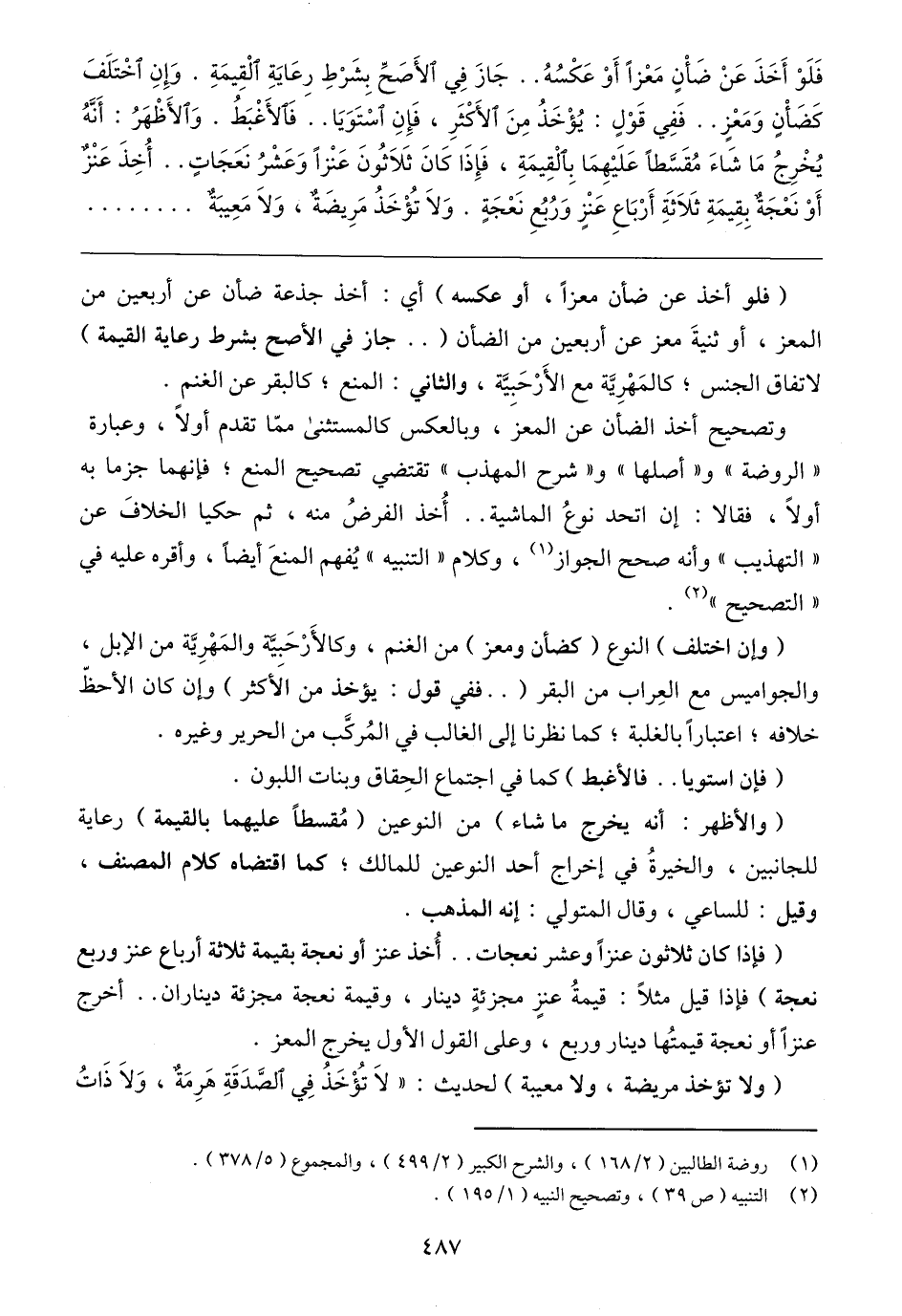 وتصحيح أخذ الضأن عن المعزَ، وبالعكس كالمستثنى ممّا تقدم أولًا، وعبارة "الروضة" و"أصلها" و"شرح المهذب" تقتضي تصحيح المنع؛ فإنهما جزما به أولًا، فقالا: إن اتحد نوعُ الماشية .. أُخذ الفرضُ منه، ثم حكيا الخلافَ عن "التهذيب" وأنه صحح الجواز (١)، وكلام "التنبيه" يُفهم المنعَ أيضًا، وأقره عليه في "التصحيح" (٢).