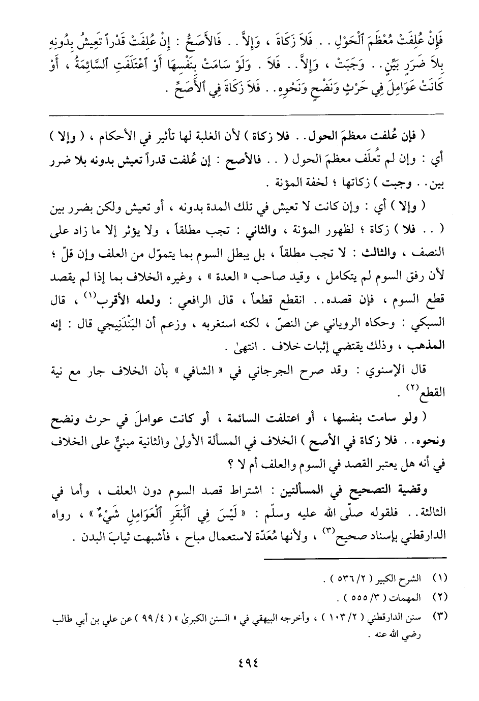 وقضية التصحيح في المسألتين: اشتراط قصد السوم دون العلف، وأما في الثالثة .. فلقوله صلّى الله عليه وسلّم: "لَيْسَ في الْبقَرِ الْعَوَامِلِ شَيْء"، رواه الدارقطني بإسناد صحيح (٣)، ولأنها مُعَدّة لاستعمال مباح، فأشبهت ثيابَ البدن.