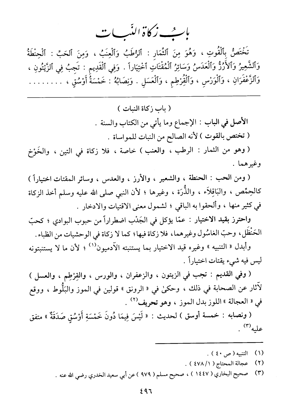 واحترز بقيد الاختيار: عمّا يؤكل في الجَدْب اضطرارًا من حبوب البوادي؛ كحبّ الحَنْظَل، وحبّ الغاسُول وغيرهما، فلا زكاة فيها؛ كما لا زكاة في الوحشيات من الظباء.
