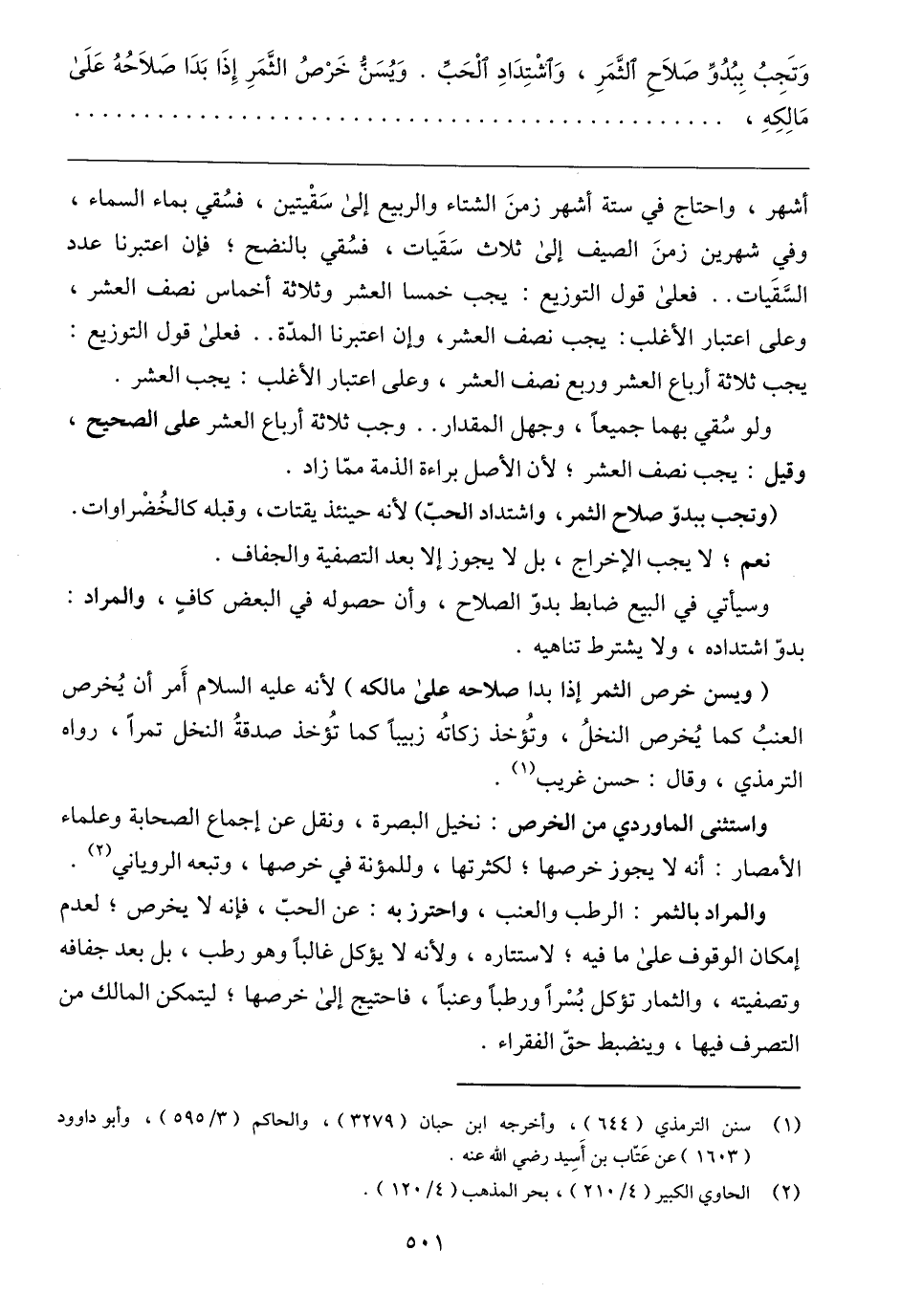 (ويسن خرص الثمر إذا بدا صلاحه على مالكه) لأنه عليه السلام أَمر أن يُخرص العنبُ كما يُخرص النخلُ، وتُؤخذ زكاتُه زبيبًا كما تُؤخذ صدقةُ النخل تمرًا، رواه الترمذي، وقال: حسن غريب (١).