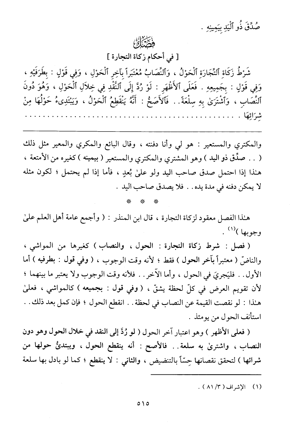 (فعلى الأظهر) وهو اعتبار آخر الحول (لو رُدَّ إلى النقد في خلال الحول وهو دون النصاب، واشترى به سلعة .. فالأصح: أنه ينقطع الحول، ويبتدئُ حولها من شرائها) لتحقق نقصانها حِسًّا بالتنضيض، والثاني: لا ينقطع؛ كما لو بادل بها سلعة