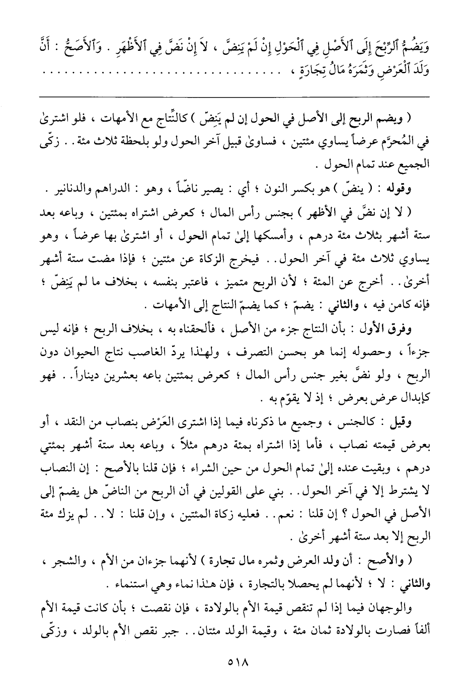 (لا إن نضَّ في الأظهر) بجنس رأس المال؛ كعرض اشتراه بمئتين، وباعه بعد ستة أشهر بثلاث مئة درهم، وأمسكها إلى تمام الحول، أو اشترى بها عرضًا، وهو يساوي ثلاث مئة في آخر الحول .. فيخرج الزكاة عن مئتين؛ فإذا مضت ستة أشهر أخرى .. أخرج عن المئة؛ لأن الربح متميز، فاعتبر بنفسه، بخلاف ما لم يَنِضّ؛ فإنه كامن فيه، والثاني: يضمّ؛ كما يضمّ النتاج إلى الأمهات.