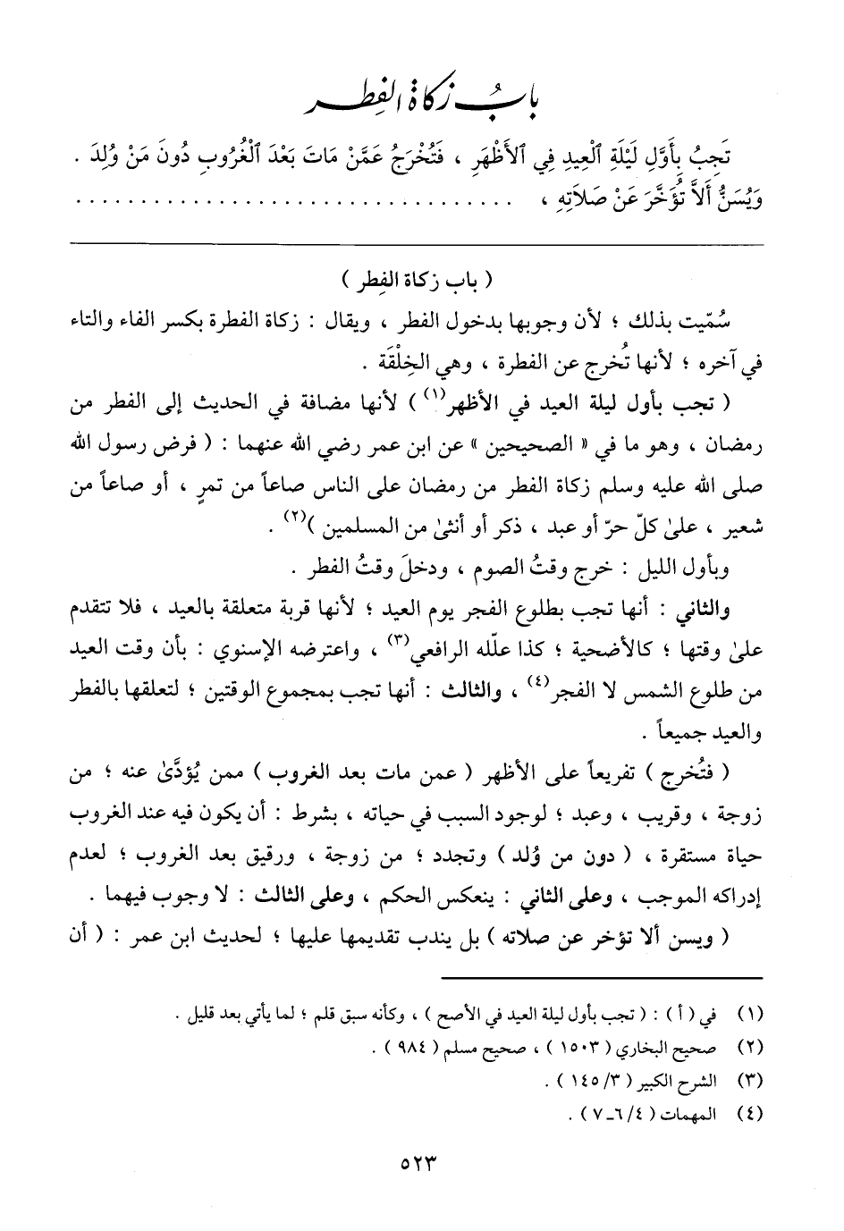 والثاني: أنها تجب بطلوع الفجر يوم العيد؛ لأنها قربة متعلقة بالعيد، فلا تتقدم على وقتها؛ كالأضحية؛ كذا علّله الرافعي (٣)، واعترضه الإسنوي: بأن وقت العيد من طلوع الشمس لا الفجر (٤)، والثالث: أنها تجب بمجموع الوقتين؛ لتعلقها بالفطر والعيد جميعًا.