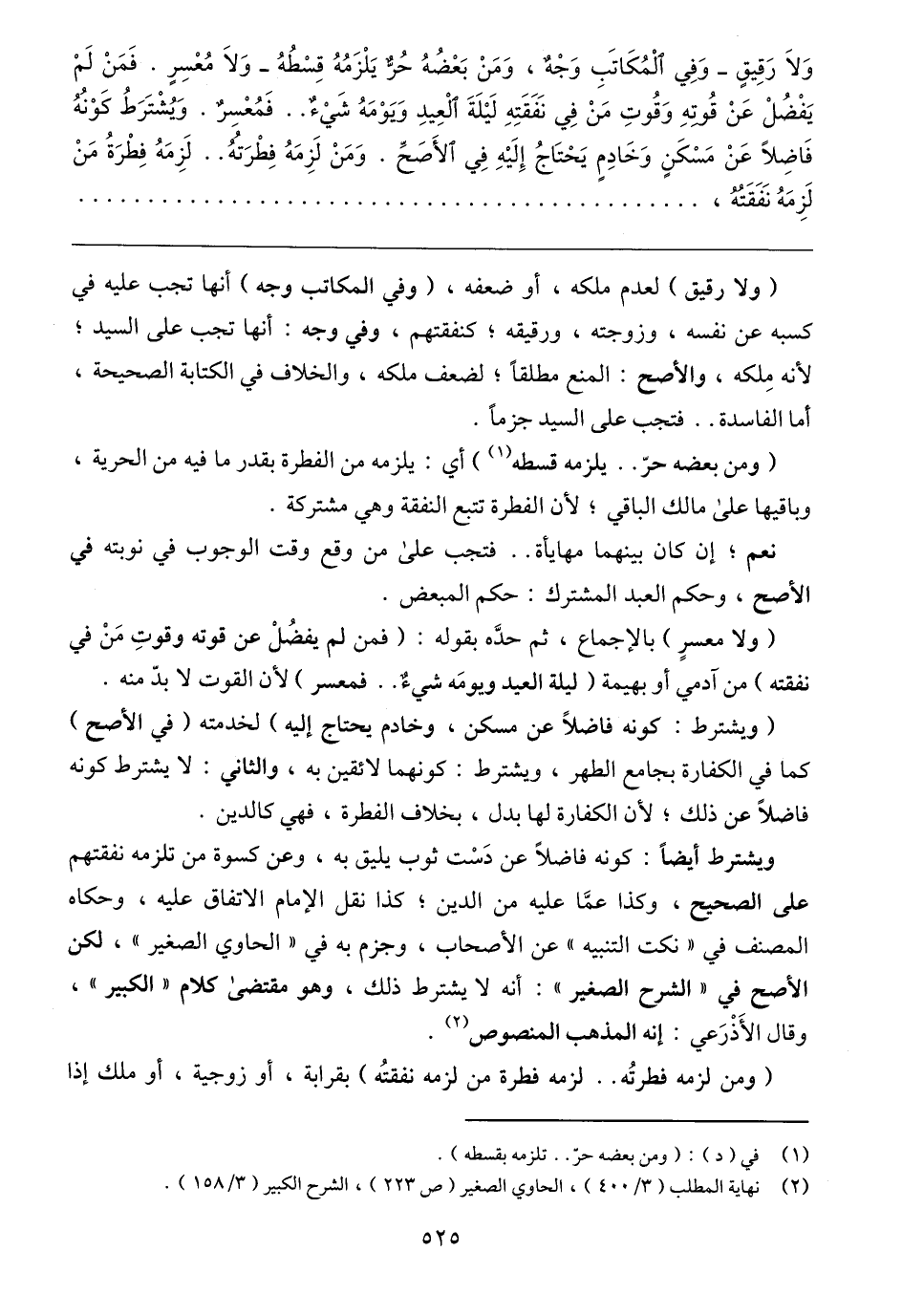 (ولا رقيق) لعدم ملكه، أو ضعفه، (وفي المكاتب وجه) أنها تجب عليه في كسبه عن نفسه، وزوجته، ورقيقه؛ كنفقتهم، وفي وجه: أنها تجب على السيد؛ لأنه مِلكه، والأصح: المنع مطلقًا؛ لضعف ملكه، والخلاف في الكتابة الصحيحة، أما الفاسدة .. فتجب على السيد جزمًا.