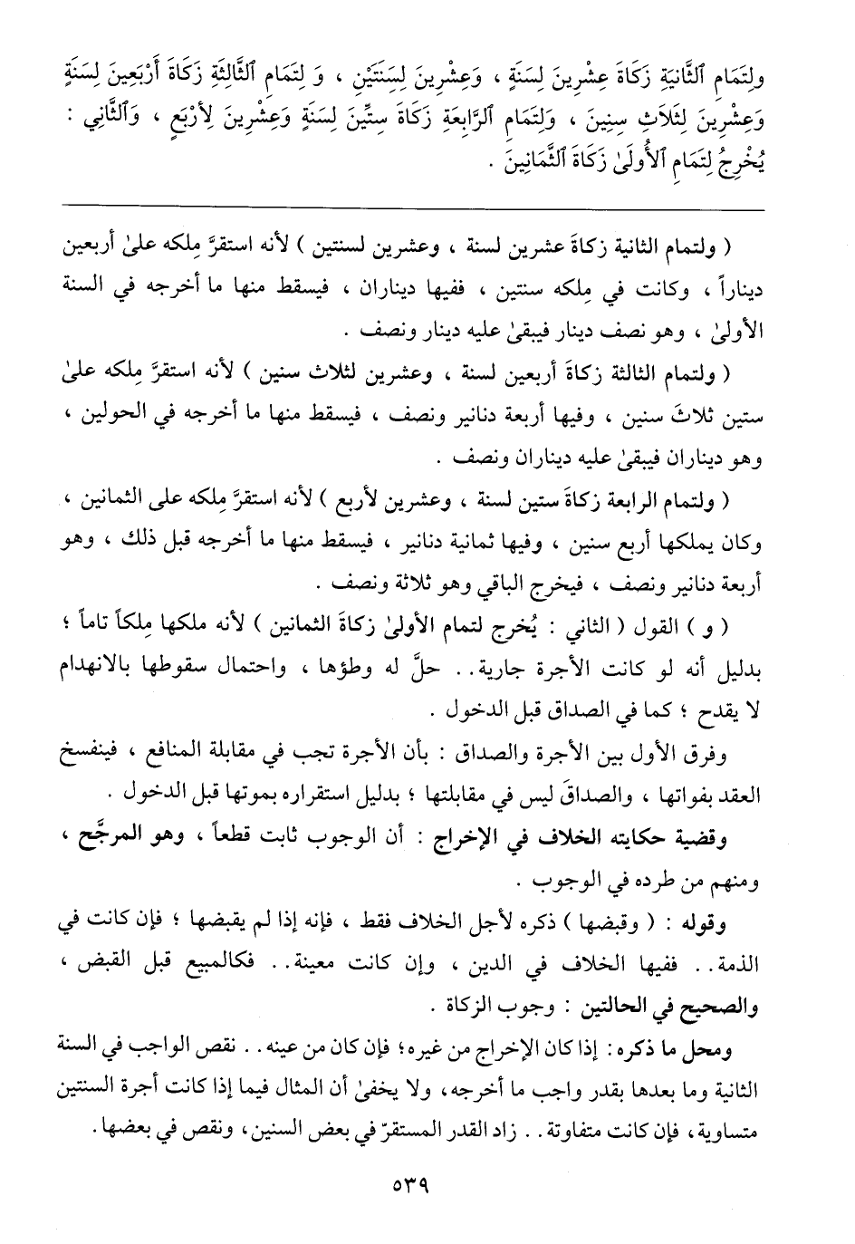 (ولتمام الثالثة زكاةَ أربعين لسنة، وعشرين لثلاث سنين) لأنه استقرَّ مِلكه على ستين ثلاثَ سنين، وفيها أربعة دنانير ونصف، فيسقط منها ما أخرجه في الحولين، وهو ديناران فيبقى عليه ديناران ونصف.