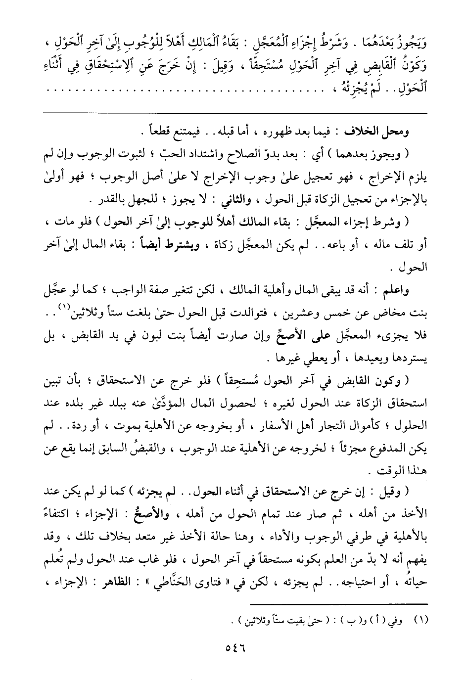 (وكون القابض في آخر الحول مُستحِقًا) فلو خرج عن الاستحقاق؛ بأن تبين استحقاق الزكاة عند الحول لغيره؛ لحصول المال المؤدَّى عنه ببلد غير بلده عند الحلول؛ كأموال التجار أهل الأسفار، أو بخروجه عن الأهلية بموت، أو ردة .. لم يكن المدفوع مجزئًا؛ لخروجه عن الأهلية عند الوجوب، والقبضُ السابق إنما يقع عن هذا الوقت.