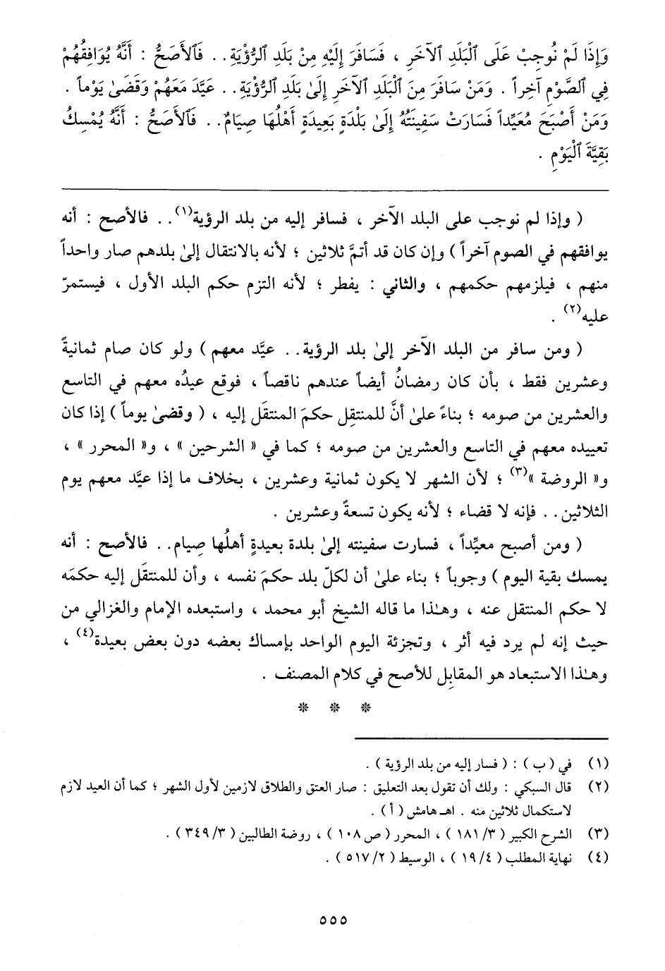 (ومن سافر من البلد الآخر إلي بلد الرؤية .. عيَّد معهم) ولو كان صام ثمانيةً وعشرين فقط، بأن كان رمضانُ أيضًا عندهم ناقصًا، فوقع عيدُه معهم في التاسع والعشرين من صومه؛ بناءً علي أنَّ للمنتقِل حكمَ المنتقَل إليه، (وقضي يومًا) إذا كان تعييده معهم في التاسع والعشرين من صومه؛ كما في "الشرحين"، و"المحرر"، و"الروضة" (٣)؛ لأن الشهر لا يكون ثمانية وعشرين، بخلاف ما إذا عيَّد معهم يوم الثلاثين .. فإنه لا قضاء؛ لأنه يكون تسعةً وعشرين.
