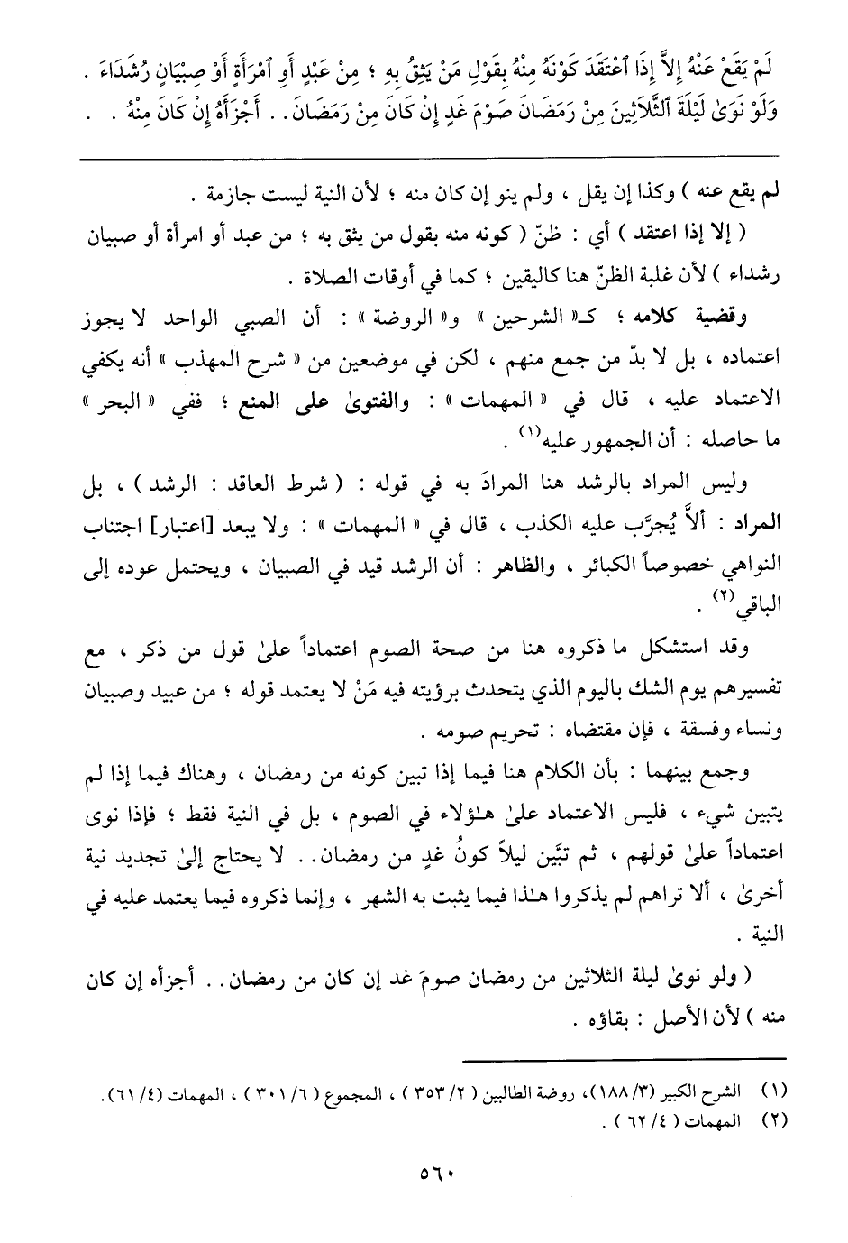 وجمع بينهما: بأن الكلام هنا فيما إذا تبين كونه من رمضان، وهناك فيما إذا لم يتبين شيء، فليس الاعتماد علي هؤلاء في الصوم، بل في النية فقط؛ فإذا نوي اعتمادًا علي قولهم، ثم تبَّين ليلًا كونُ غدٍ من رمضان .. لا يحتاج إلي تجديد نية أخرى، ألا تراهم لم يذكروا هذا فيما يثبت به الشهر، وإنما ذكروه فيما يعتمد عليه في النية.