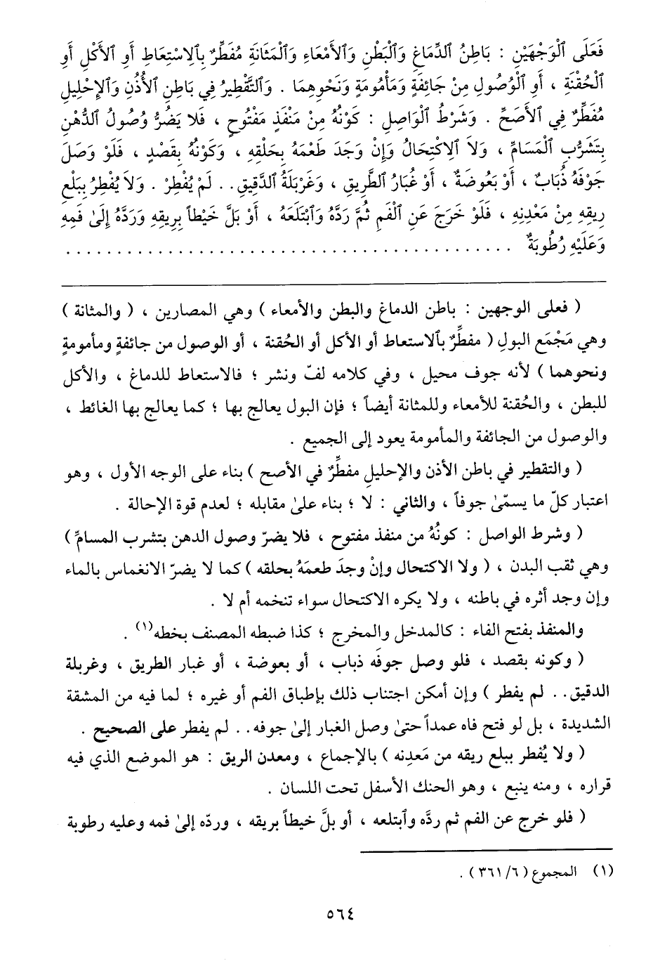 (فعلى الوجهين: باطن الدماغ والبطن والأمعاء) وهي المصارين، (والمثانة) وهي مَجْمَع البولِ (مفطِّرٌ بالاستعاط أو الأكل أو الحُقنة، أو الوصول من جائفةٍ ومأمومةٍ ونحوهما) لأنه جوف محيل، وفي كلامه لفّ ونشر؛ فالاستعاط للدماغ، والأكل للبطن، والحُقنة للأمعاء وللمثانة أيضًا؛ فإن البول يعالج بها؛ كما يعالج بها الغائط، والوصول من الجائفة والمأمومة يعود إلى الجميع.
