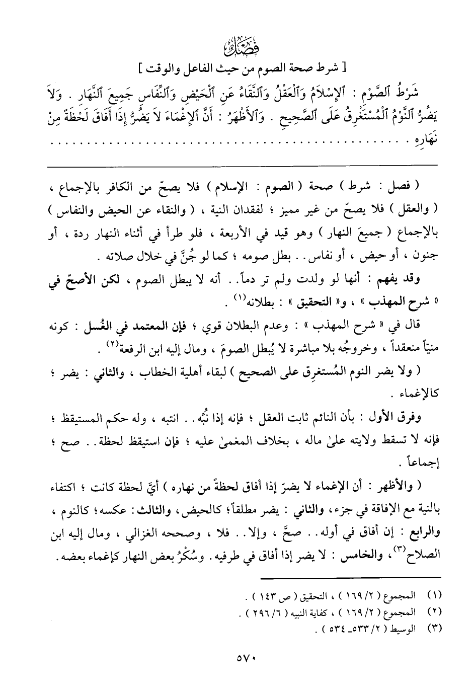 (والأظهر: أن الإغماء لا يضرّ إذا أفاق لحظةً من نهاره) أيَّ لحظة كانت؛ اكتفاء بالنية مع الإفاقة في جزء، والثاني: يضر مطلقًا؛ كالحيض، والثالث: عكسه؛ كالنوم، والرابع: إن أفاق في أوله .. صحَّ، وإلا .. فلا، وصححه الغزالي، ومال إليه ابن الصلاح (٣)، والخامس: لا يضر إذا أفاق في طرفيه. وسُكْرُ بعض النهار كإغماء بعضه.