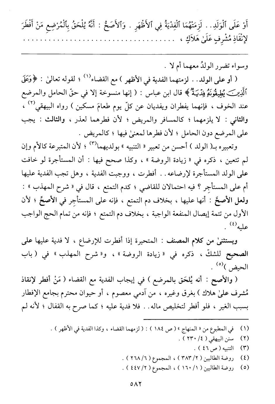 وتعبيره بـ (الولد) أحسن من تعبير "التنبيه" بولديهما (٣)؛ لأن المتبرعة كالأم وإن لم تتعين، ذكره في "زيادة الروضة"، وكذا صحح فيها: أن المستأجرة لو خافت على الولد المستأجرة لإرضاعه .. أفطرت، ووجبت الفدية، وهل تجب الفدية عليها أم على المستأجِر؟ فيه احتمالان للقاضي؛ كدم التمتع، قال في "شرح المهذب": ولعل الأصحَّ: أنها عليها، بخلاف دم التمتع، فإنه على المستأجِر في الأصحِّ؛ لأن الأول من تتمة إيصال المنفعة الواجبة، بخلاف دم التمتع، فإنه من تمام الحج الواجب عليه (٤).