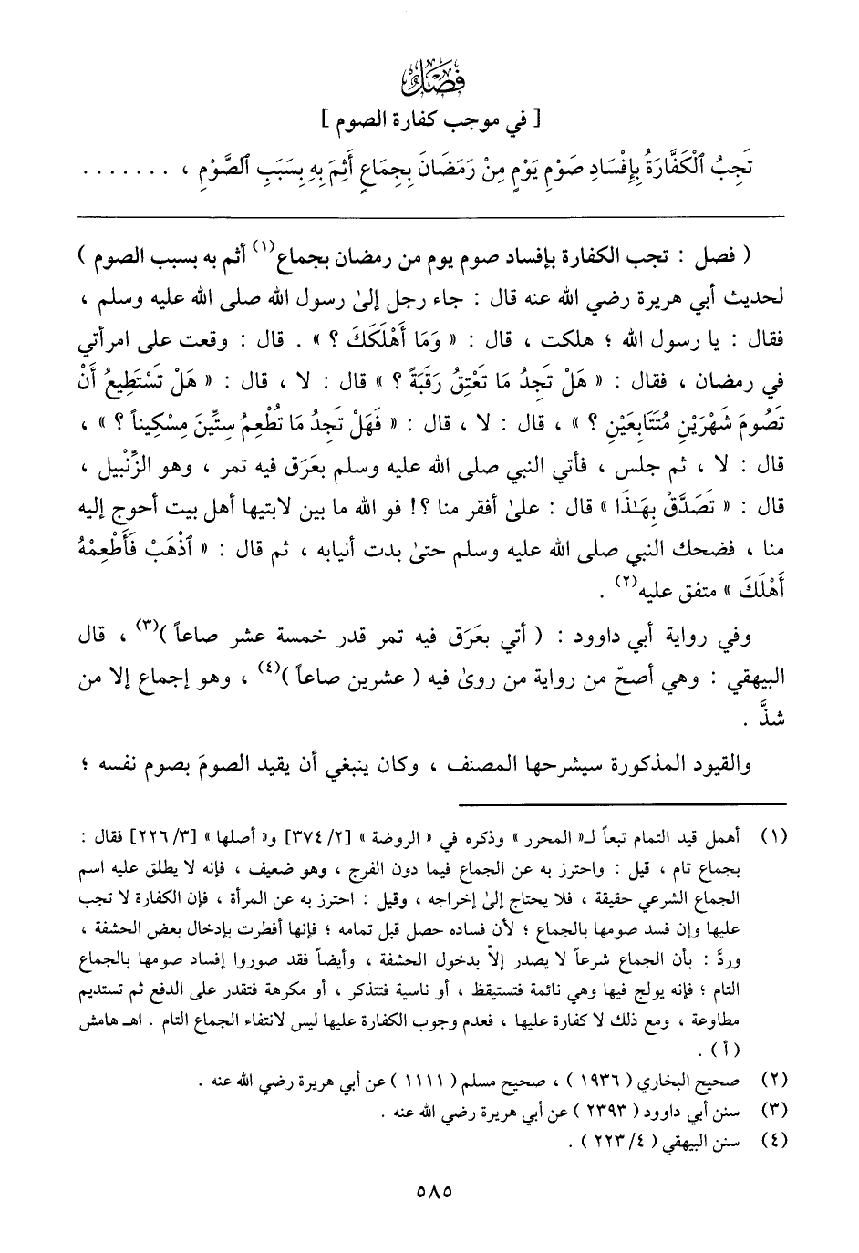 (فصل: تجب الكفارة بإفساد صوم يوم من رمضان بجماع (١) أثم به بسبب الصوم) لحديث أبي هريرة رضي الله عنه قال: جاء رجل إلي رسول الله صلى الله عليه وسلم، فقال: يا رسول الله؛ هلكت، قال: "وَمَا أَهْلَكَكَ؟ ". قال: وقعت على امرأتي في رمضان، فقال: "هَلْ تَجِدُ مَا تَعْتِقُ رَقَبَةً؟ " قال: لا، قال: "هَلْ تَسْتَطِيعُ أَنْ تَصُومَ شَهْرَيْنِ مُتَتَابِعَيْنِ؟ "، قال: لا، قال: "فَهَلْ تَجِدُ مَا تُطْعِمُ سِتِّينَ مِسْكِينًا؟ "، قال: لا، ثم جلس، فأتى النبي صلى الله عليه وسلم بعَرَق فيه تمر، وهو الزِّنْبيل، قال: "تَصَدَّقْ بِهَذَا" قال: على أفقر منا؟ ! فو الله ما بين لابتيها أهل بيت أحوج إليه منا، فضحك النبي صلى الله عليه وسلم حتى بدت أنيابه، ثم قال: "أذْهَبْ فَأَطْعِمْهُ أَهْلَكَ" متفق عليه (٢).