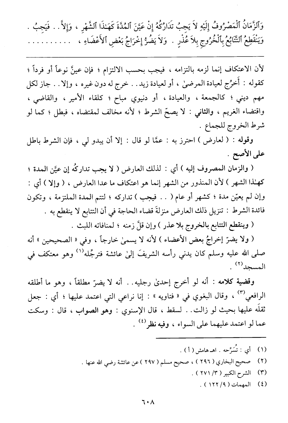 (والزمان المصروف إليه) أي: لذلك العارض (لا يجب تداركُه إن عيَّن المدة؛ كهذا الشهر) لأن المنذور من الشهر إنما هو اعتكاف ما عدا العارض، (وإلا) أي: وإن لم يعيّن مدة؛ كشهر أو عام ( .. فيجب) تداركه؛ لتتم المدة الملتزمة، وتكون فائدة الشرط: تنزيل ذلك العارض منزلةَ قضاء الحاجة في أن التتابع لا ينقطع به.