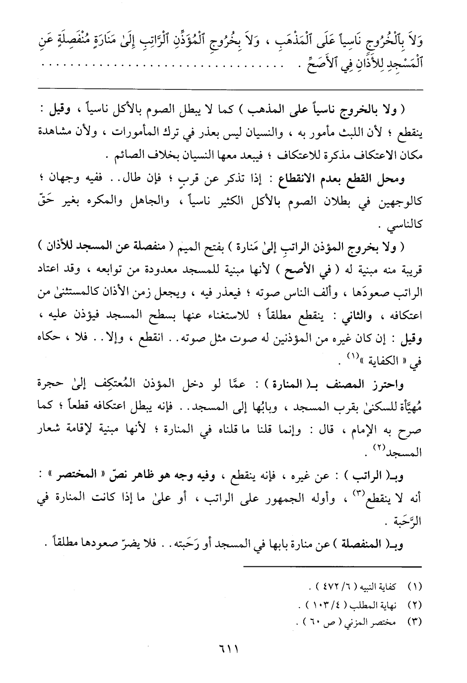 (ولا بخروج المؤذن الراتبِ إلى مَنارة) بفتح الميم (منفصلة عن المسجد للأذان) قريبة منه مبنية له (في الأصح) لأنها مبنية للمسجد معدودة من توابعه، وقد اعتاد الراتب صعودَها، وألف الناس صوته؛ فيعذر فيه، ويجعل زمن الأذان كالمستثنى من اعتكافه، والثاني: ينقطع مطلقًا؛ للاستغناء عنها بسطح المسجد فيؤذن عليه، وقيل: إن كان غيره من المؤذنين له صوت مثل صوته .. انقطع، وإلا .. فلا، حكاه في "الكفاية" (١).