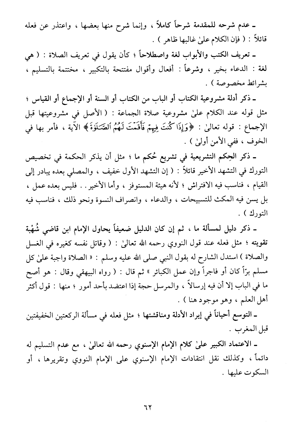 - ذكر أدلة مشروعية الكتاب أو الباب من الكتاب أو السنة أو الإجماع أو القياس؛ مثل قوله عند الكلام على مشروعية صلاة الجماعة: (الأصل في مشروعيتها قبل الإجماع: قوله تعالى: {وَإِذَا كُنْتَ فِيهِمْ فَأَقَمْتَ لَهُمُ الصَّلَاةَ} الآية، فأمر بها في الخوف، ففي الأمن أولى).