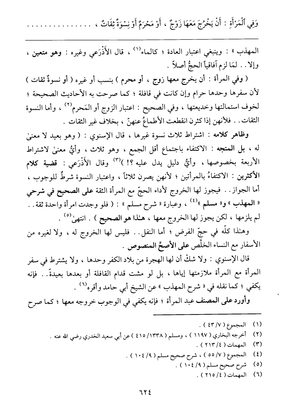 وظاهر كلامه: اشتراط ثلاث نسوة غيرها، قال الإسنوي: (وهو بعيد لا معنى له، بل المتجه: الاكتفاء باجتماع أقل الجمع، وهو ثلاث، وأيُّ معنى لاشتراط الأربعة بخصوصها، وأيُّ دليل يدل عليه؟ ! ) (٣) وقال الأَذْرَعي: قضية كلام الأكثرين: الاكتفاءُ بالمرأتين؛ لأنهن يصرن ثلاثًا، واعتبار النسوة شرط للوجوب، أما الجواز .. فيجوز لها الخروج لأداء الحجّ مع المرأة الثقة على الصحيح في شرحي "المهذب" و"مسلم" (٤)، وعبارة "شرح مسلم": (فلو وجدت امرأة واحدة ثقة .. لم يلزمها، لكن يجوز لها الخروج معها، هذا هو الصحيح). انتهى (٥).