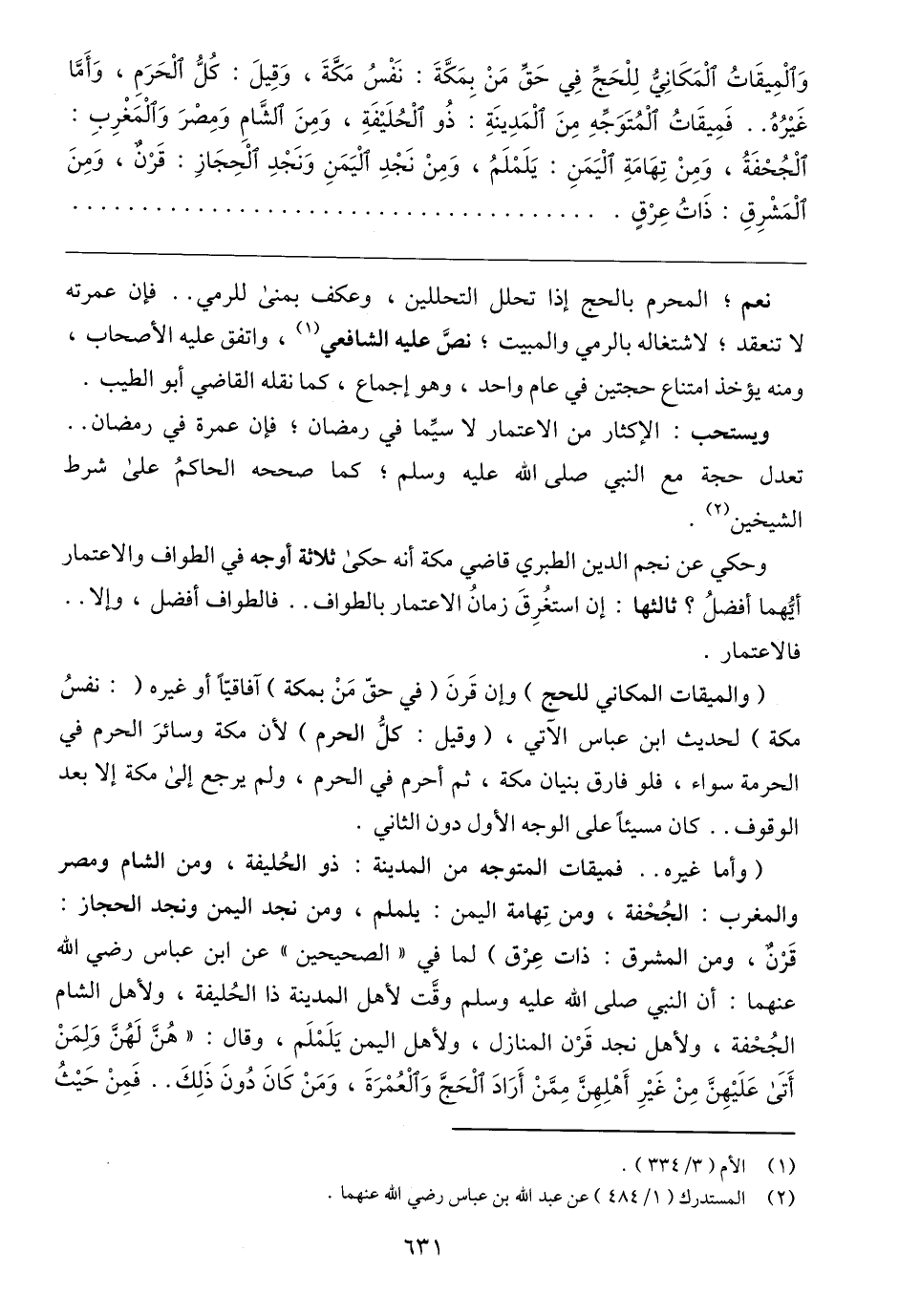 (وأما غيره .. فميقات المتوجه من المدينة: ذو الحُليفة، ومن الشام ومصر والمغرب: الجُحْفة، ومن تِهامة اليمن: يلملم، ومن نجد اليمن ونجد الحجاز: قَرْن، ومن المشرق: ذات عِرْق) لما في "الصحيحين" عن ابن عباس رضي الله عنهما: أن النبي صلى الله عليه وسلم وقَّت لأهل المدينة ذا الحُليفة، ولأهل الشام الجُحْفة، ولأهل نجد قَرْن المنازل، ولأهل اليمن يَلَمْلَم، وقال: "هُنَّ لَهُنَّ وَلِمَنْ أَتىَ عَلَيْهِنَّ مِنْ غَيْرِ أَهْلِهِنَّ مِمَّنْ أَرَادَ الْحَجَّ وَالْعُمْرَةَ، وَمَنْ كَانَ دُونَ ذَلِكَ .. فَمِنْ حَيْثُ