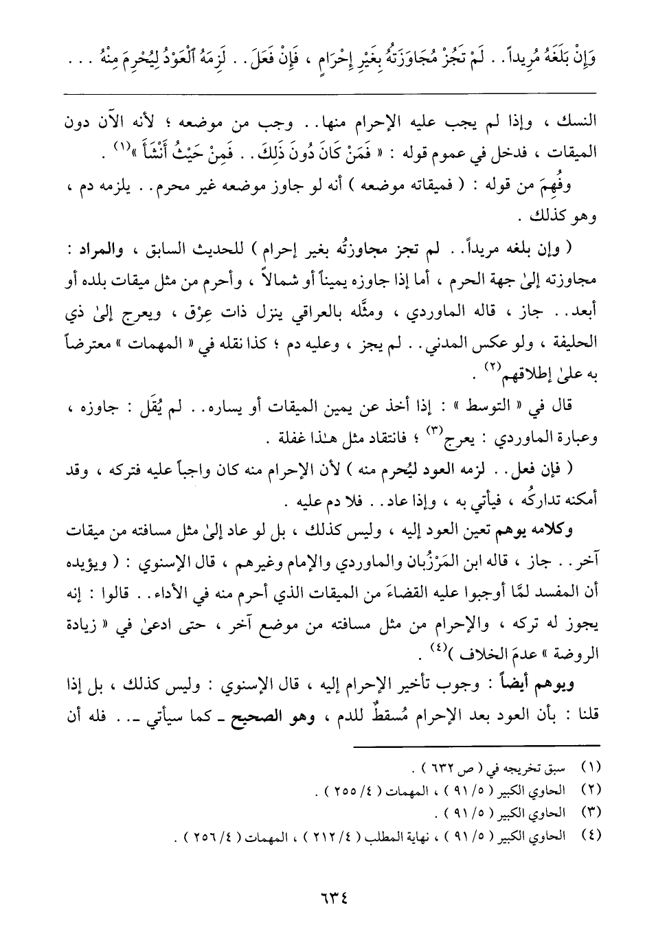 (وإن بلغه مريدًا .. لم تجز مجاوزتُه بغير إحرام) للحديث السابق، والمراد: مجاوزته إلى جهة الحرم، أما إذا جاوزه يمينًا أو شمالًا، وأحرم من مثل ميقات بلده أو أبعد .. جاز، قاله الماوردي، ومثَّله بالعراقي ينزل ذات عِرْف، ويعرج إلى ذي الحليفة، ولو عكس المدني .. لم يجز، وعليه دم؛ كذا نقله في "المهمات" معترضًا به على إطلاقهم (٢).