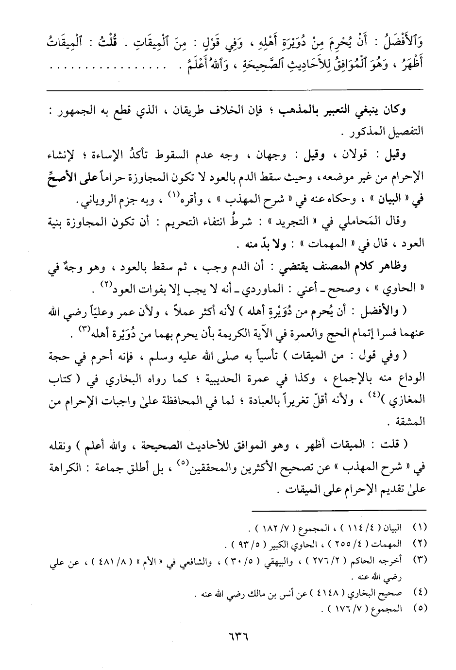 (قلت: الميقات أظهر، وهو الموافق للأحاديث الصحيحة، والله أعلم) ونقله في "شرح المهذب" عن تصحيح الأكثرين والمحققين (٥)، بل أطلق جماعة: الكراهة على تقديم الإحرام على الميقات.