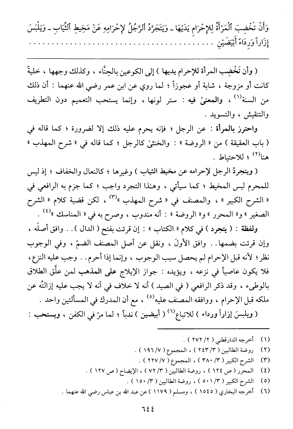 (وأن تَخْضِب المرأة للإحرام يديها) إلى الكوعين بالحِنَّاء، وكذلك وجهها، خليةً كانت أو مزوجة، شابة أو عجوزًا، لما روي عن ابن عمر رضي الله عنهما: أن ذلك من السنة (١)، والمعنى فيه: ستر لونها، وإنما يستحب التعميم دون التطريف والتنقيش، والتسويد.