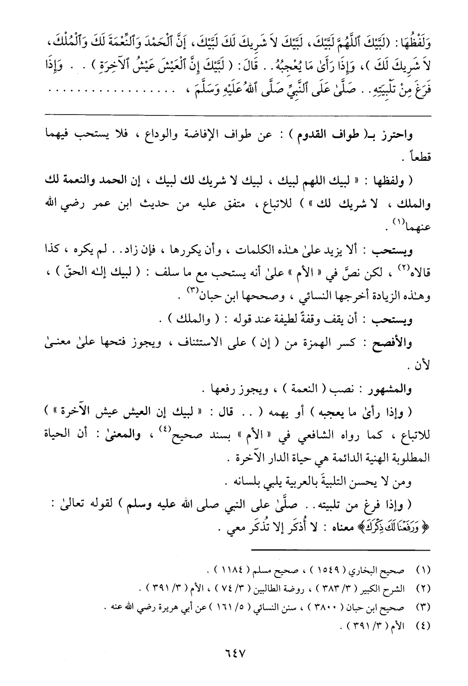 (ولفظها: "لبيك اللهم لبيك، لبيك لا شريك لك لبيك، إن الحمد والنعمة لك والملك، لا شريك لك") للاتباع، متفق عليه من حديث ابن عمر رضي الله عنهما (١).
