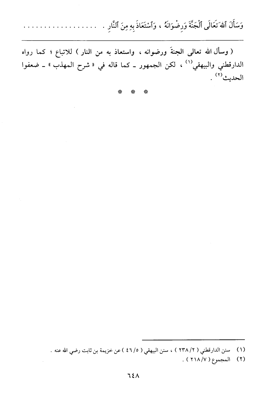 (وسأل الله تعالى الجنةَ ورضوانه، واستعاذ به من النار) للاتباع؛ كما رواه الدارقطني والبيهقي (١)، لكن الجمهور - كما قاله في "شرح المهذب" - ضعفوا الحديث (٢).
