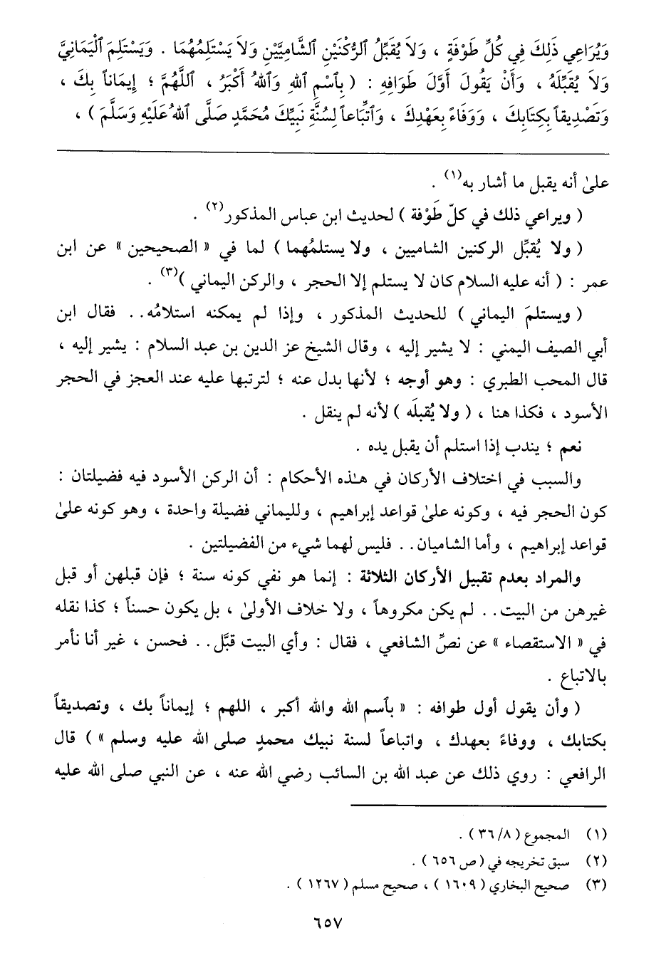 (وأن يقول أول طوافه: "باسم الله والله أكبر، اللهم؛ إيمانًا بك، وتصديقًا بكتابك، ووفاءً بعهدك، واتباعًا لسنة نبيك محمدٍ - صلى الله عليه وسلم -") قال الرافعي: روي ذلك عن عبد الله بن السائب - رضي الله عنه -، عن النبي - صلى الله عليه