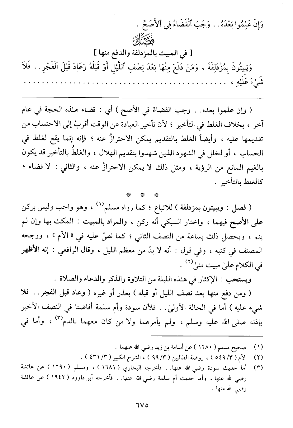 (ومن دفع منها بعد نصف الليل أو قبله) بعذر أو غيره (وعاد قبل الفجر .. فلا شيء عليه) أما في الحالة الأولى .. فلأن سودة وأم سلمة أفاضتا في النصف الأخير بإذنه -صلى الله عليه وسلم-، ولم يأمرهما ولا من كان معهما بالدم (٣)، وأما في