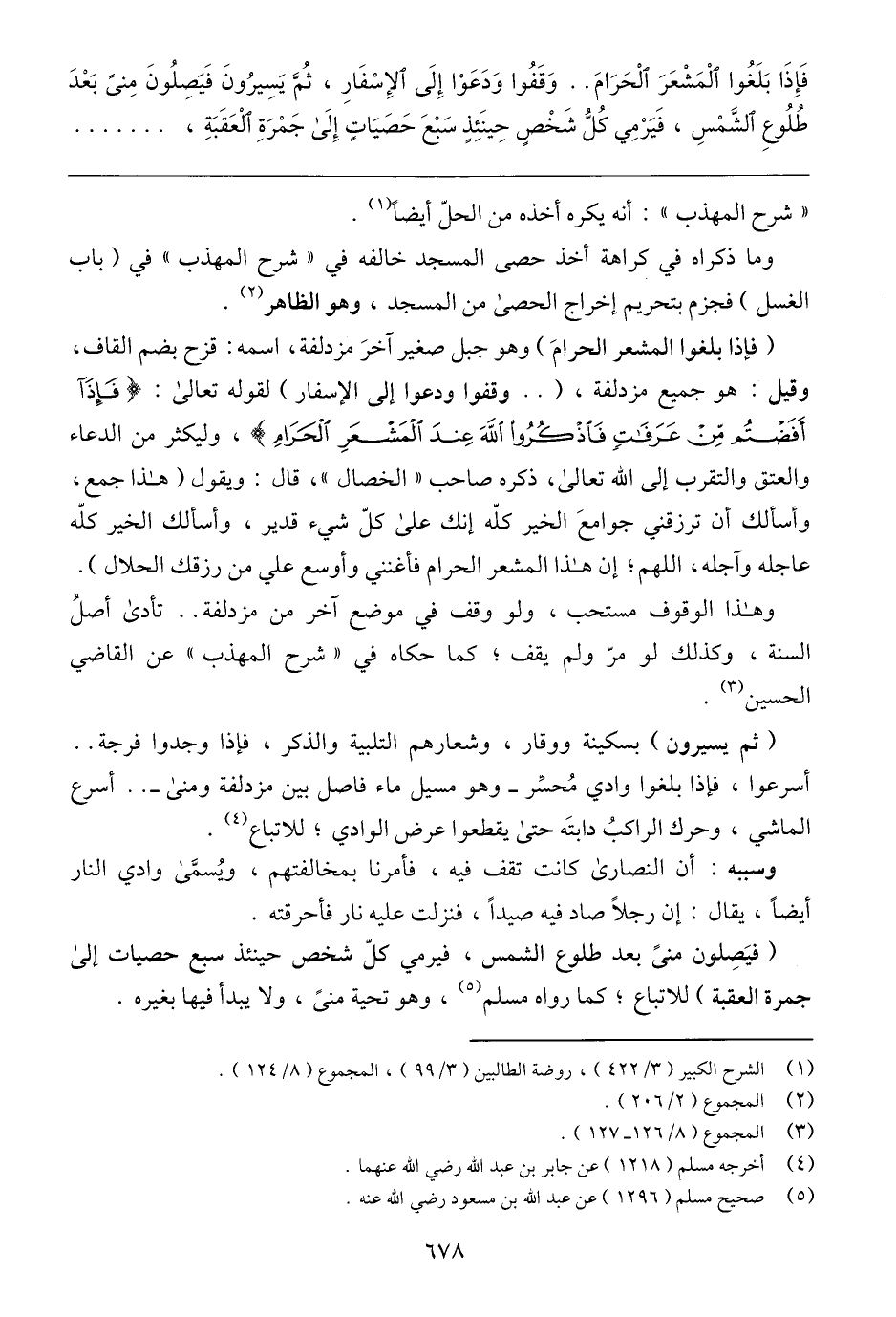 (ثم يسيرون) بسكينة ووقار، وشعارهم التلبية والذكر، فإذا وجدوا فرجة .. أسرعوا، فإذا بلغوا وادي مُحسِّر -وهو مسيل ماء فاصل بين مزدلفة ومنى- .. أسرع الماشي، وحرك الراكبُ دابتَه حتى يقطعوا عرض الوادي؛ للاتباع (٤).