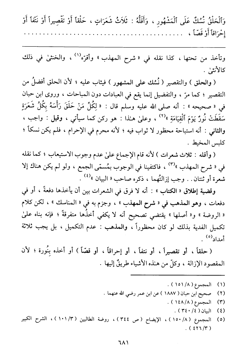 وقضية إطلاق "الكتاب": أنه لا فرق في الشعرات بين أن يأخذها دفعةً، أو في دفعات، وهو المذهب في "شرح المهذب"، وجزم به في "المناسك"، لكن كلام "الروضة" و"أصلها" يقتضي تصحيح أنه لا يكفي أخذُها متفرقةً؛ فإنه بناه على تكميل الفدية بذلك لو كان محظورًا، والمذهب: عدم التكميل، بل يجب ثلاثة أمداد (٥).