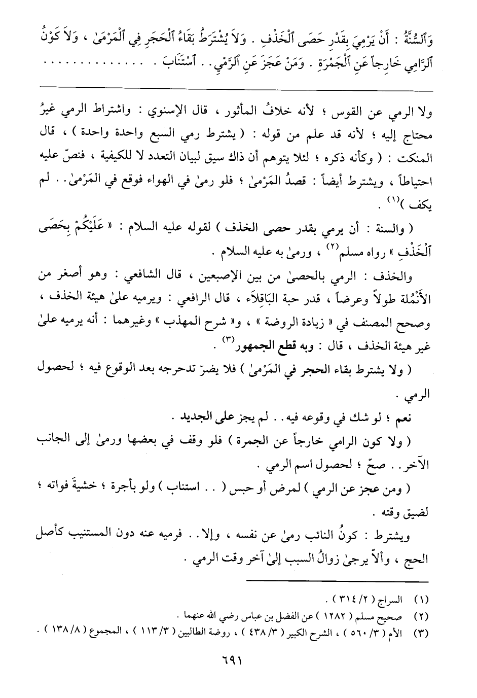 (والسنة: أن يرمي بقدر حصى الخذف) لقوله عليه السلام: "عَلَيْكُمْ بِحَصَى الْخَذْفِ" رواه مسلم (٢)، ورمى به عليه السلام.