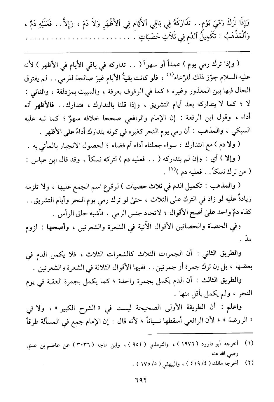 (والمذهب: تكميل الدم في ثلاث حصيات) لوقوع اسم الجمع عليها، ولا تلزمه زيادةٌ عليه لو زاد في الترك على الثلاث، حتى لو ترك رمي يوم النحر وأيام التشريق .. كفاه دمٌ واحد على أصح الأقوال؛ لاتحاد جنس الرمي، فأشبه حلق الرأس.