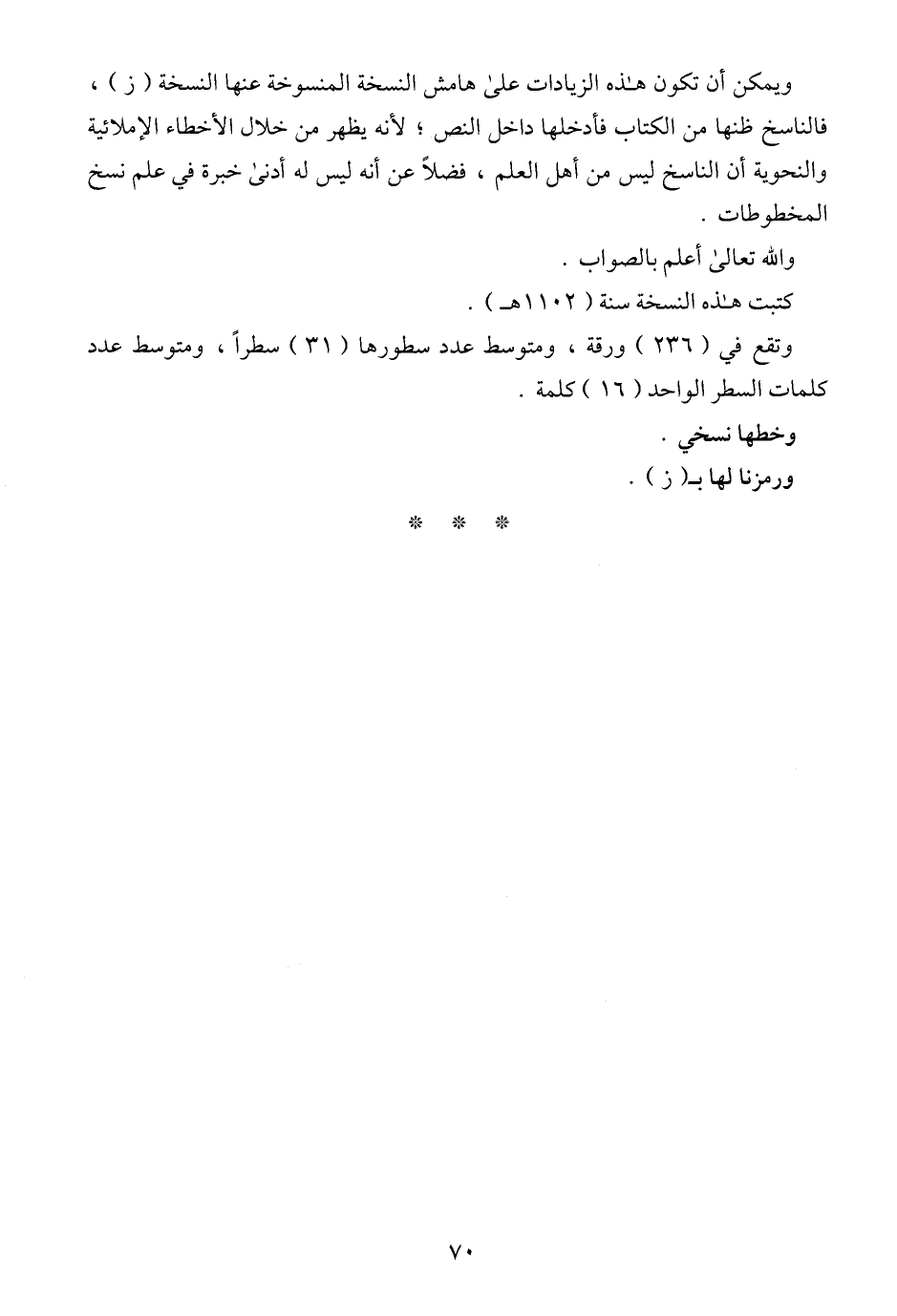 ويمكن أن تكون هذه الزيادات على هامش النسخة المنسوخة عنها النسخة (ز)، فالناسخ ظنها من الكتاب فأدخلها داخل النص؛ لأنه يظهر من خلال الأخطاء الإملائية والنحوية أن الناسخ ليس من أهل العلم، فضلًا عن أنه ليس له أدنى خبرة في علم نسخ المخطوطات.