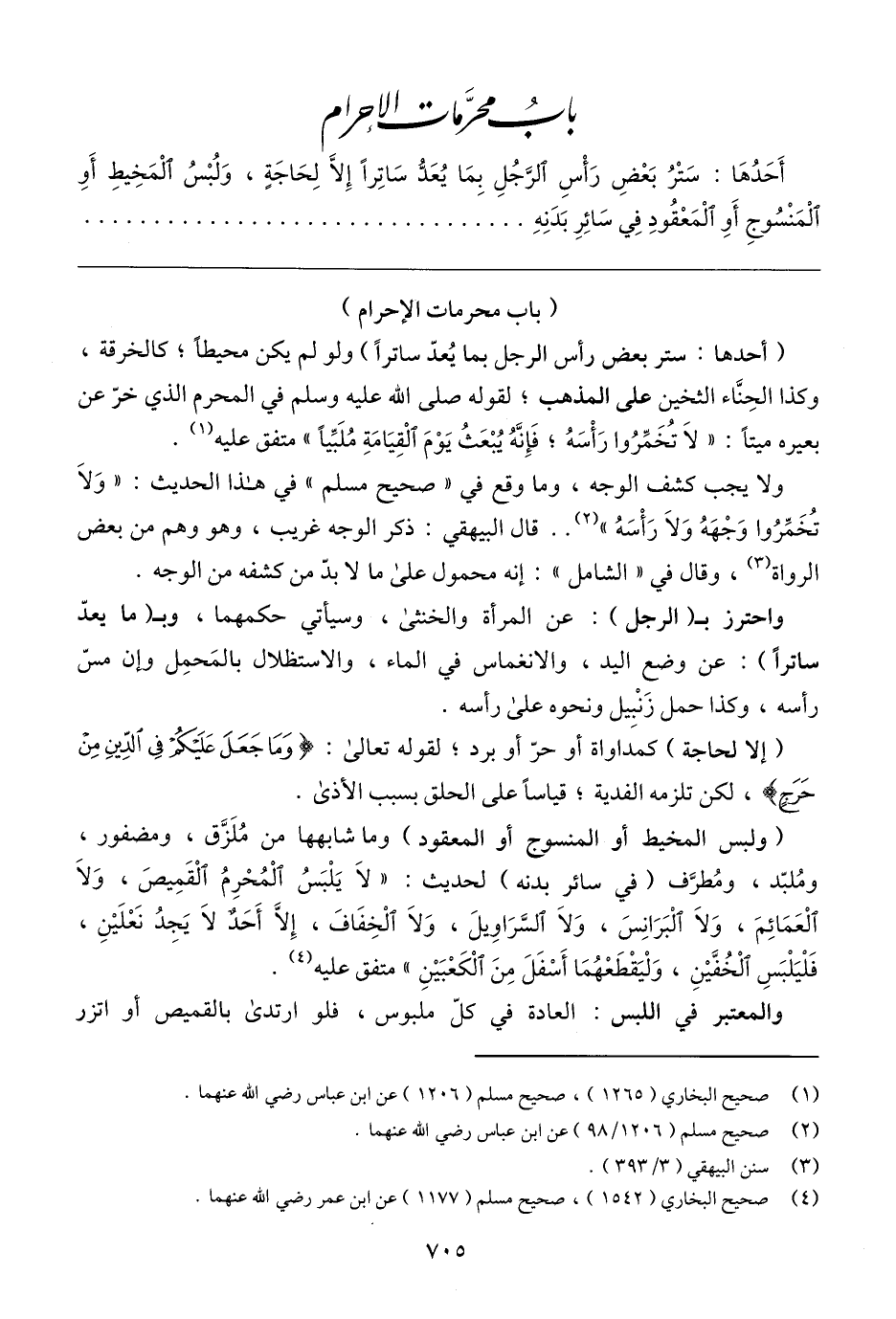(ولبس المخيط أو المنسوج أو المعقود) وما شابهها من مُلَزَّق، ومضفور، ومُلبّد، ومُطرَّف (في سائر بدنه) لحديث: "لَا يَلْبَسُ الْمُحْرِمُ الْقَمِيصَ، وَلَا الْعَمَائِمَ، وَلَا الْبَرَانِسَ، وَلَا السَّرَاوِيلَ، وَلَا الْخِفَافَ، إِلَّا أَحَدٌ لَا يَجِدُ نَعْلَيْنِ، فَلْيَلْبَسِ الْخُفَّيْنِ، وَلْيَقْطَعْهُمَا أَسْفَلَ مِنَ الْكَعْبَيْنِ" متفق عليه (٤).
