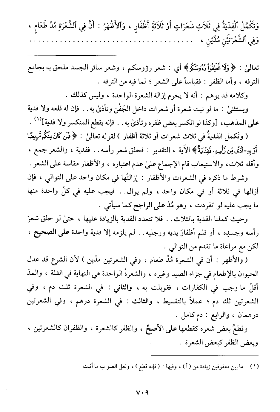 (وتَكمل الفديةُ في ثلاث شعرات أو ثلاثة أظفار) لقوله تعالى: {فَمَنْ كَانَ مِنْكُمْ مَرِيضًا أَوْ بِهِ أَذًى مِنْ رَأْسِهِ فَفِدْيَةٌ} الآية، التقدير: فحلق شعر رأسه .. ففدية، والشعر جمع، وأقله ثلاث، والاستيعاب قام الإجماع على عدم اعتباره، والأظفار مقاسة على الشعر.