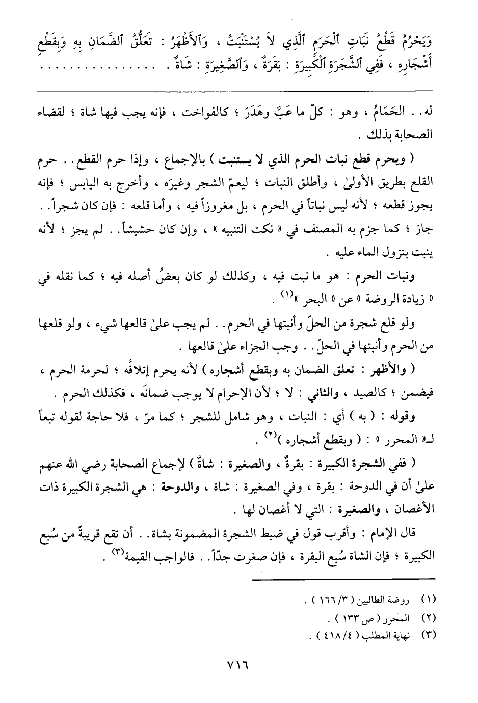 قال الإمام: وأقرب قول في ضبط الشجرة المضمونة بشاة .. أن تقع قريبةً من سُبع الكبيرة؛ فإن الشاة سُبع البقرة، فإن صغرت جدًّا .. فالواجب القيمة (٣).