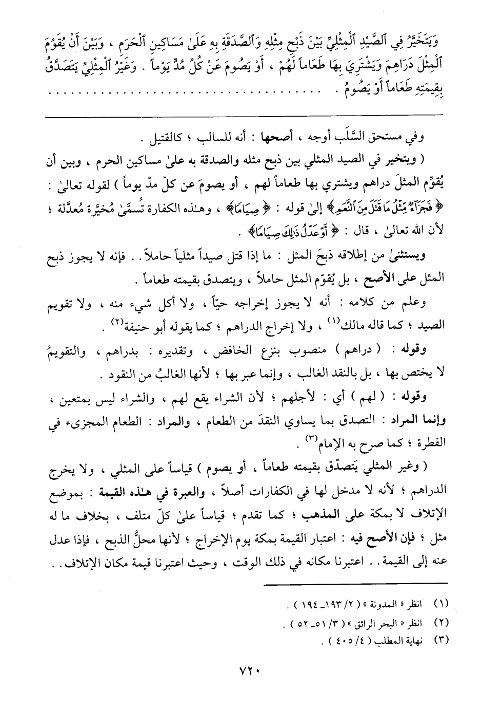 (ويتخير في الصيد المثلي بين ذبح مثله والصدقة به على مساكين الحرم، وبين أن يُقوِّم المثلَ دراهم ويشتري بها طعامًا لهم، أو يصومَ عن كلّ مدّ يومًا) لقوله تعالى: {فَجَزَاءٌ مِثْلُ مَا قَتَلَ مِنَ النَّعَمِ} إلى قوله: {صِيَامًا}، وهذه الكفارة تُسمَّى مُخيَّرة مُعدَّلة؛ لأن الله تعالى، قال: {أَوْ عَدْلُ ذَلِكَ صِيَامًا}.